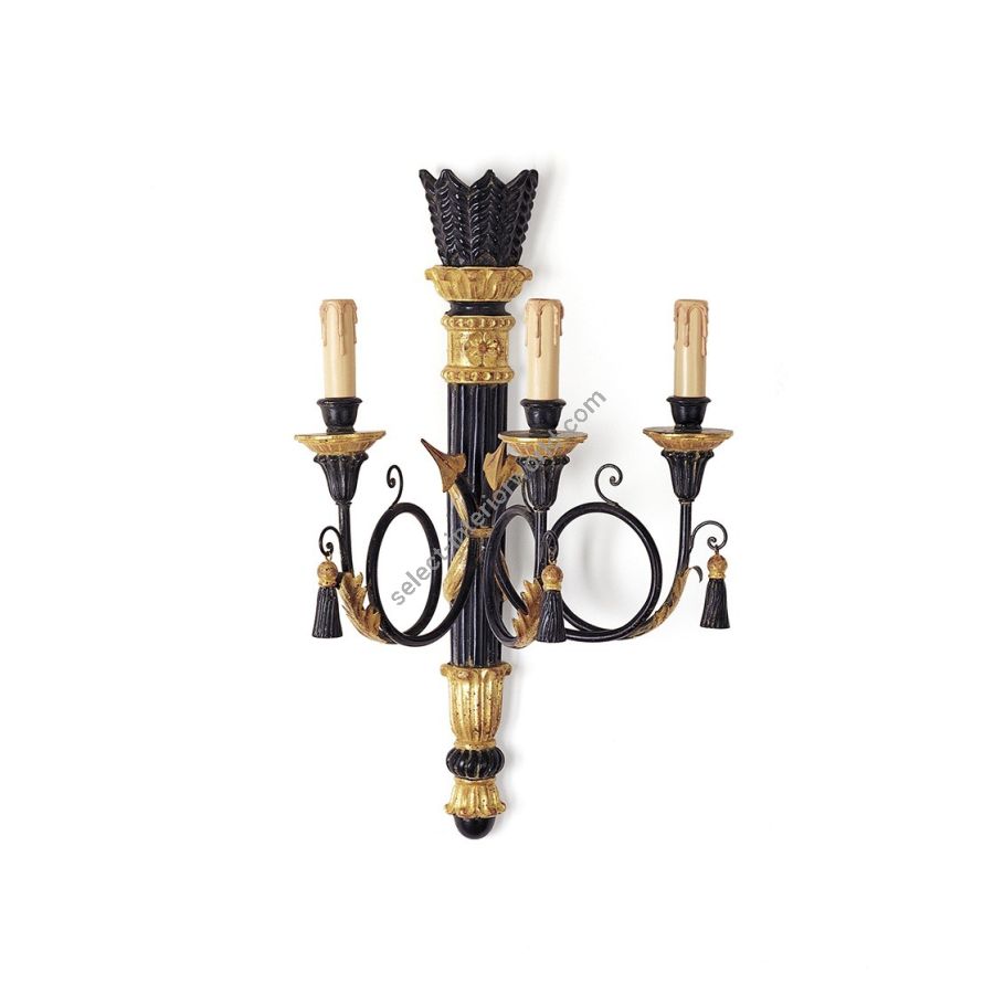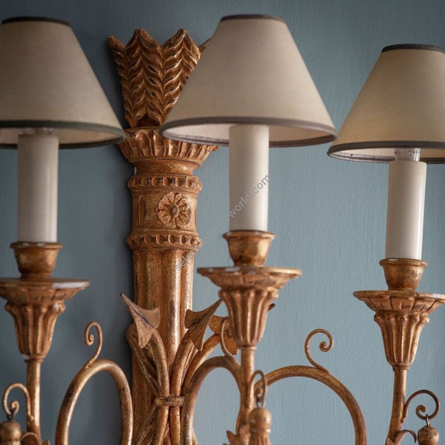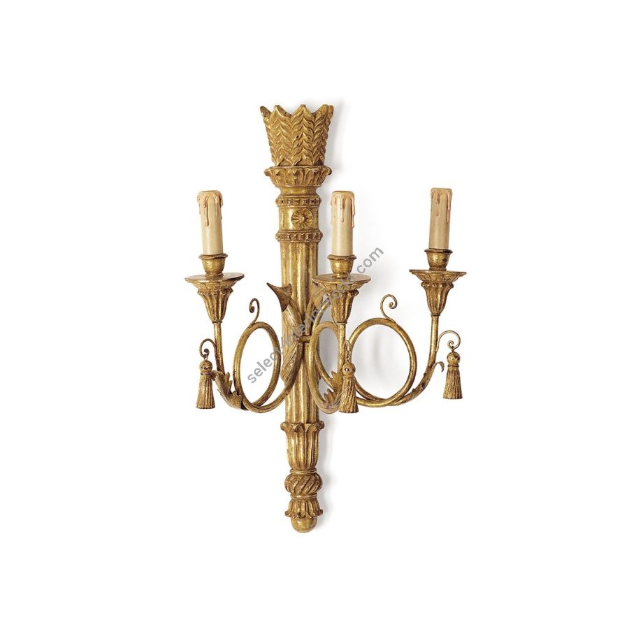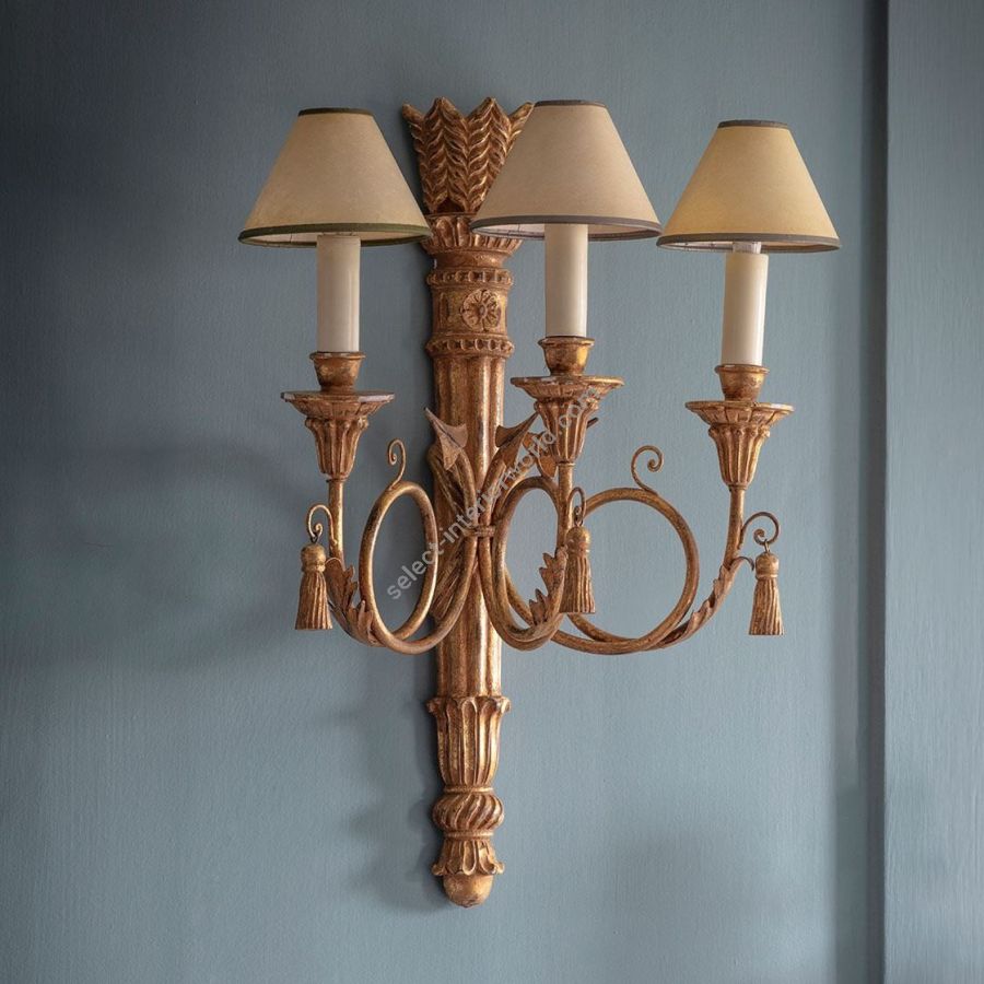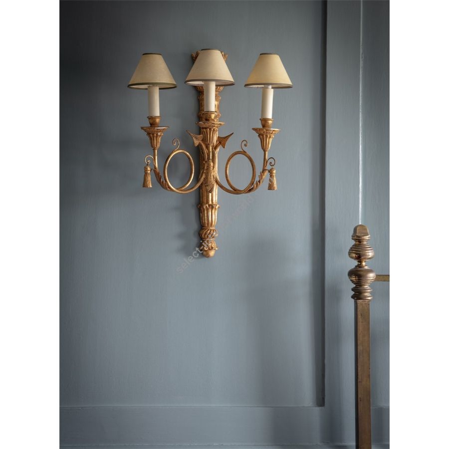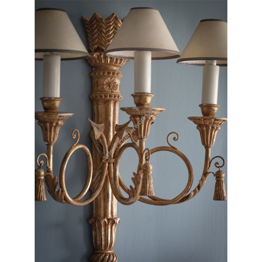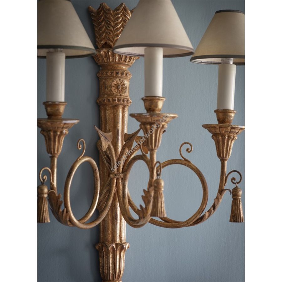 The Athena is a Regency style decorative three-branch wall light. Its body is carved as a quiver of arrows made of three scrolling branches, and it also features carved pendant tassels.