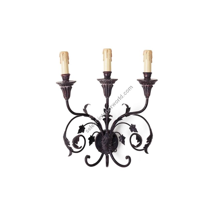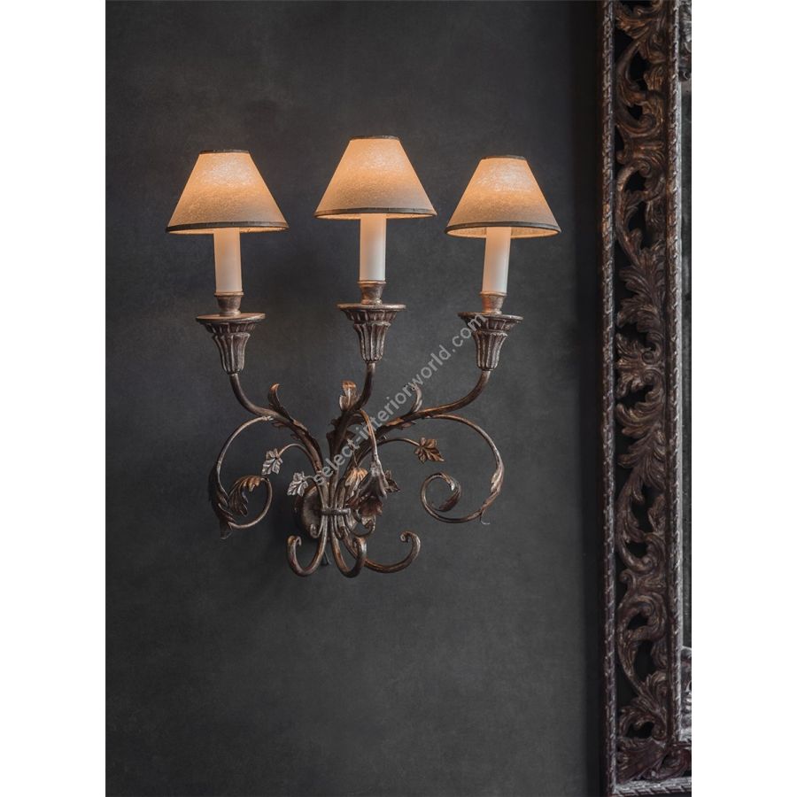 The Pisa is a tall, three-branch wall light, with a light but metallic design comprising scrolls and leaves.