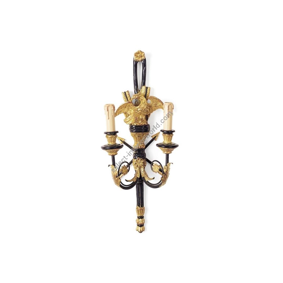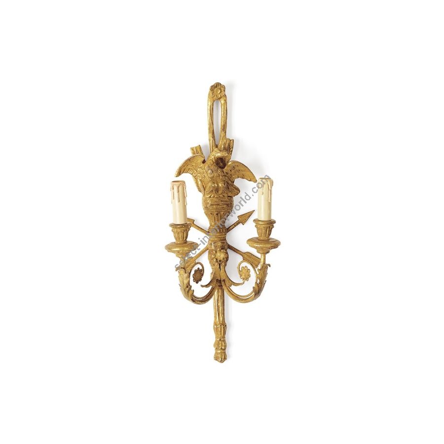 A finely carved decorative wall light. This light has two branches scrolling from a classical column, it includes crossed arrows and an elaborate eagle decoration suspended from a carved swag. Available with left and right facing eagle.