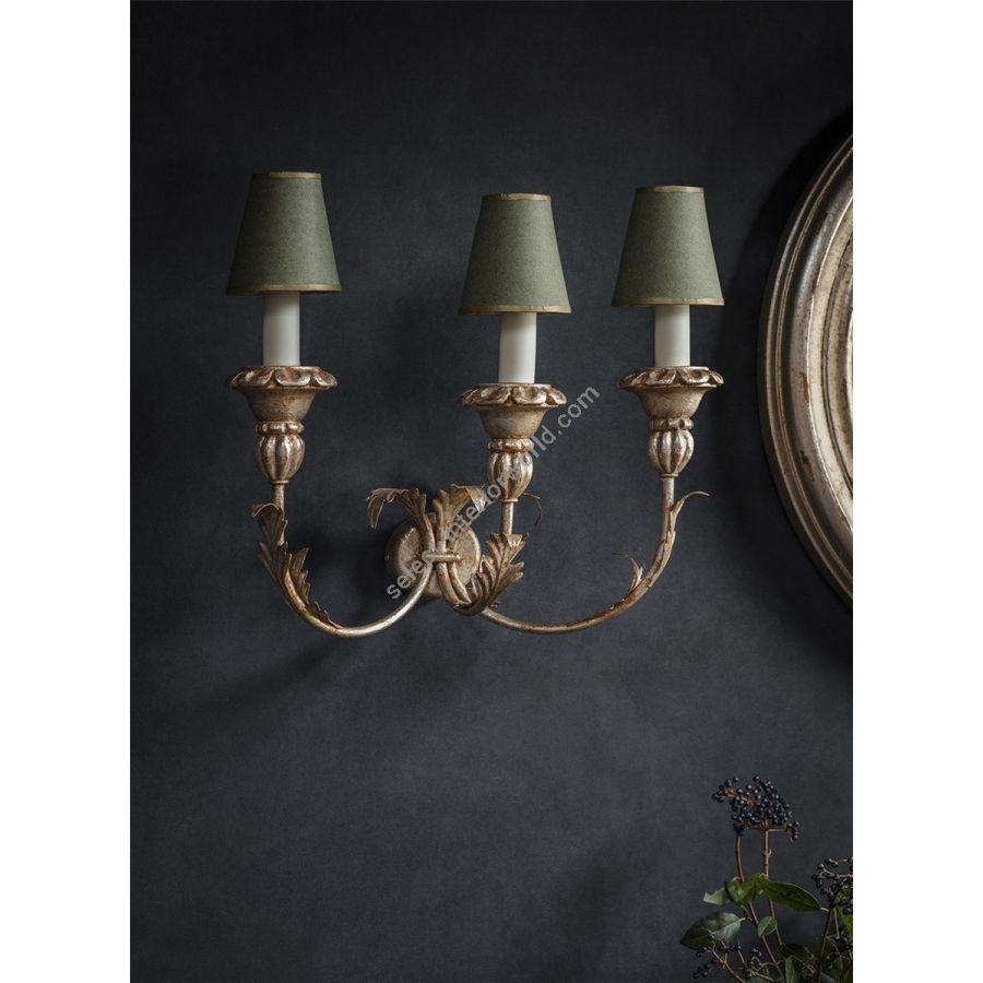 The Turino is a three-branch wall light with carved wooden bulb holders supported by scrolling arms decorated with carved acanthus leaves.
