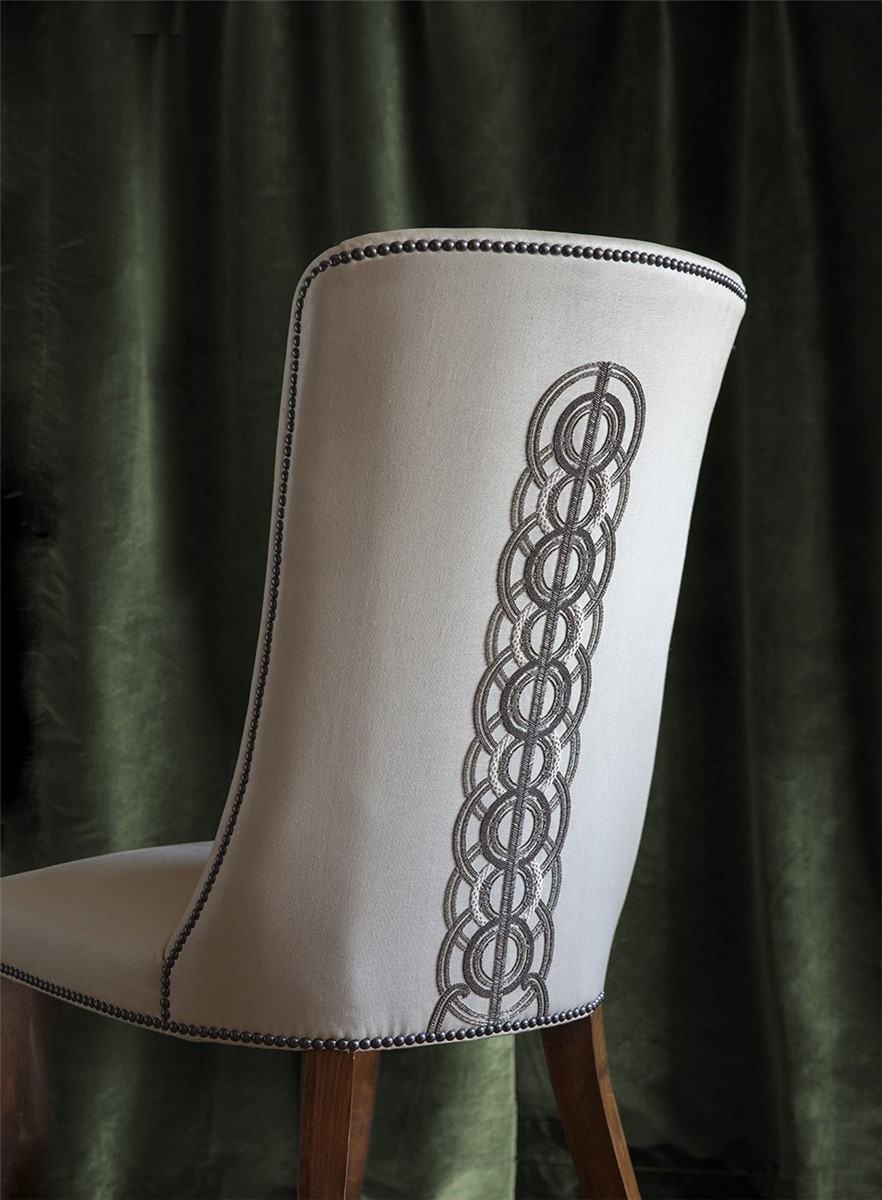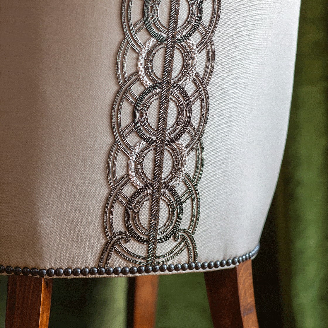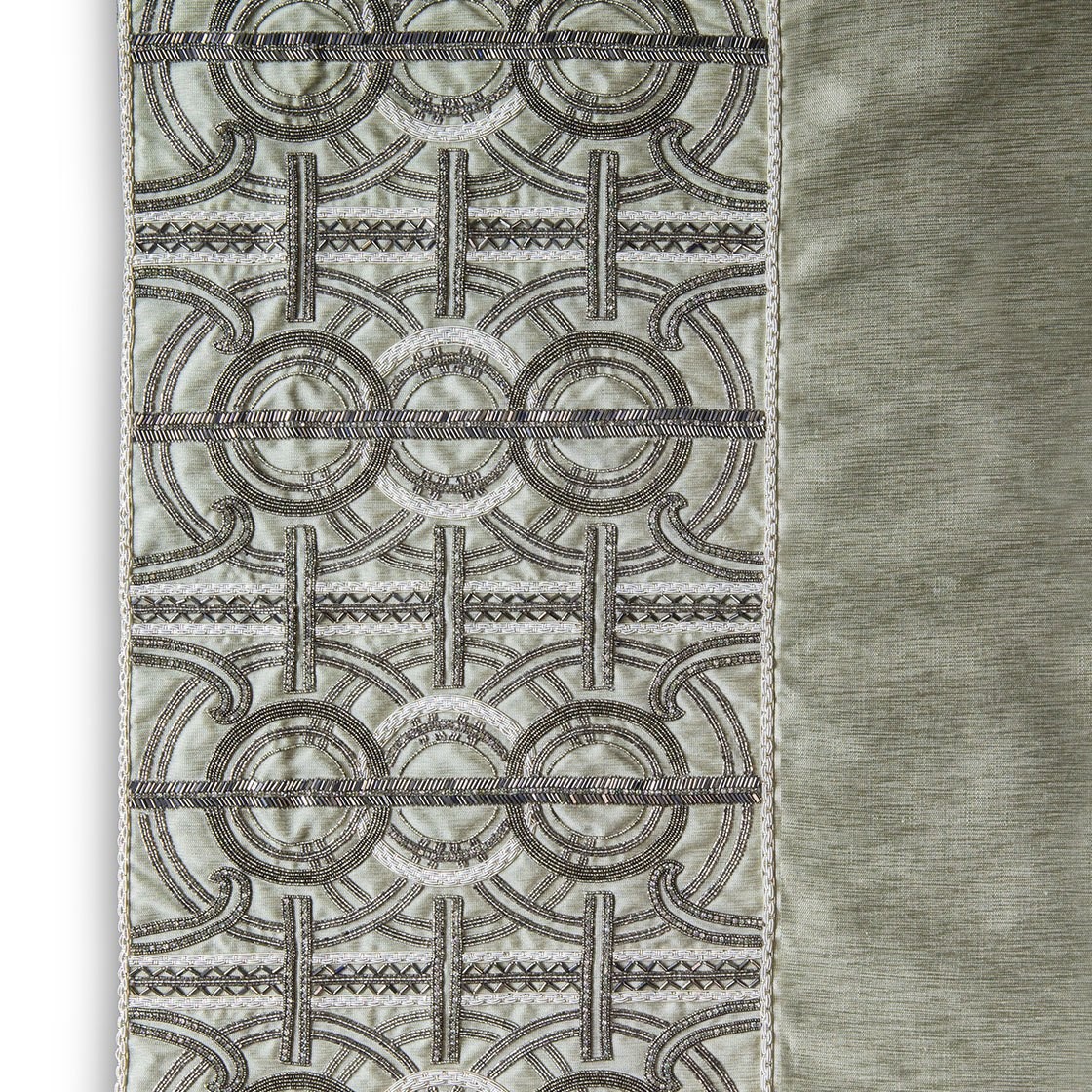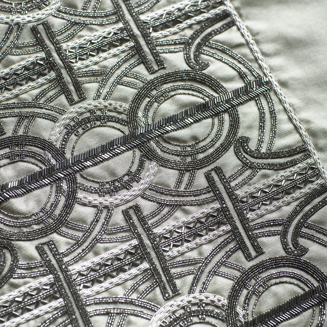 An incredibly luxurious and striking design, Circe’s pattern comprises of concentric circles and strong regimented lines for an Art Deco feel further enhanced by the beautiful hand sewn beadwork.