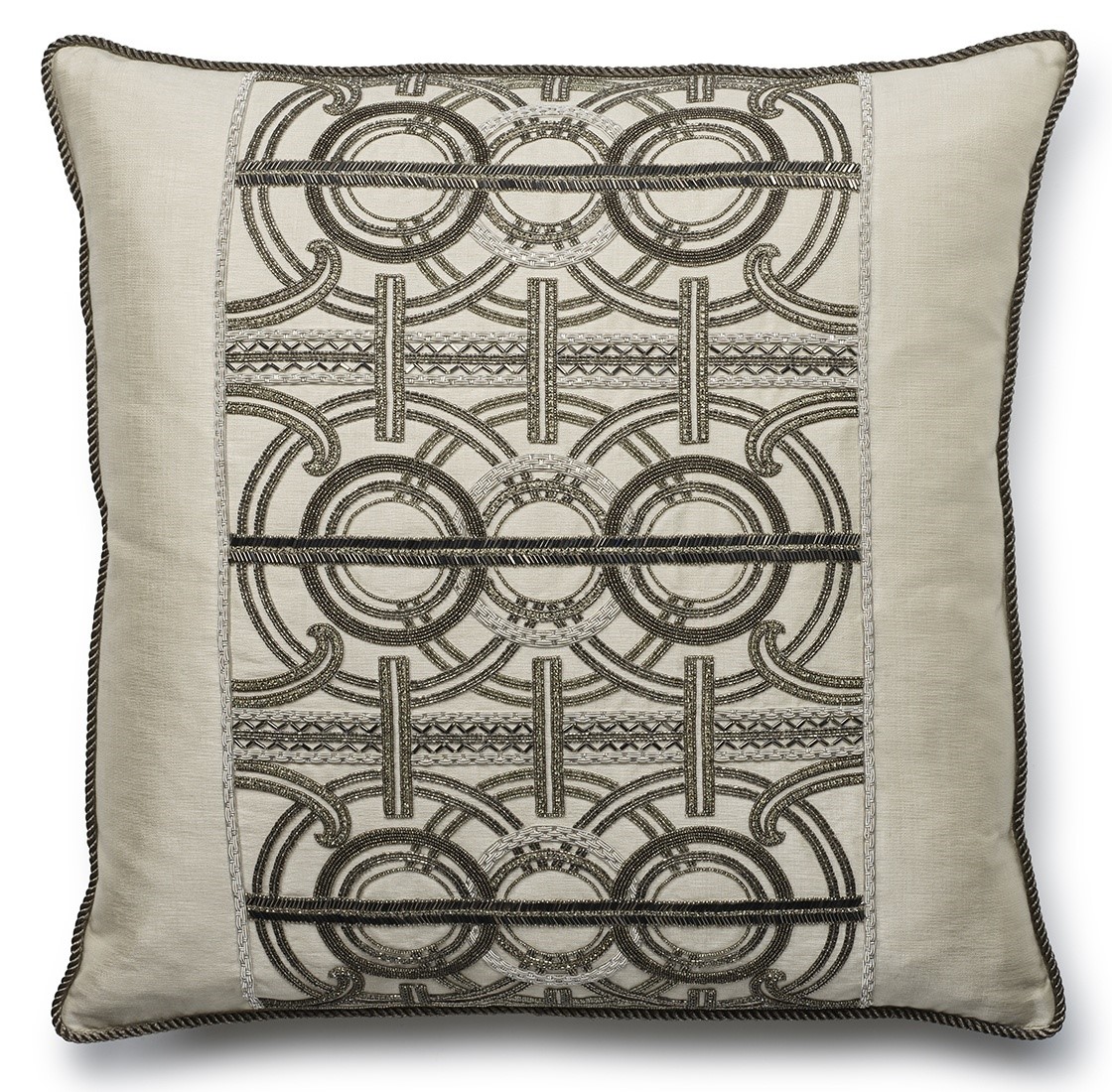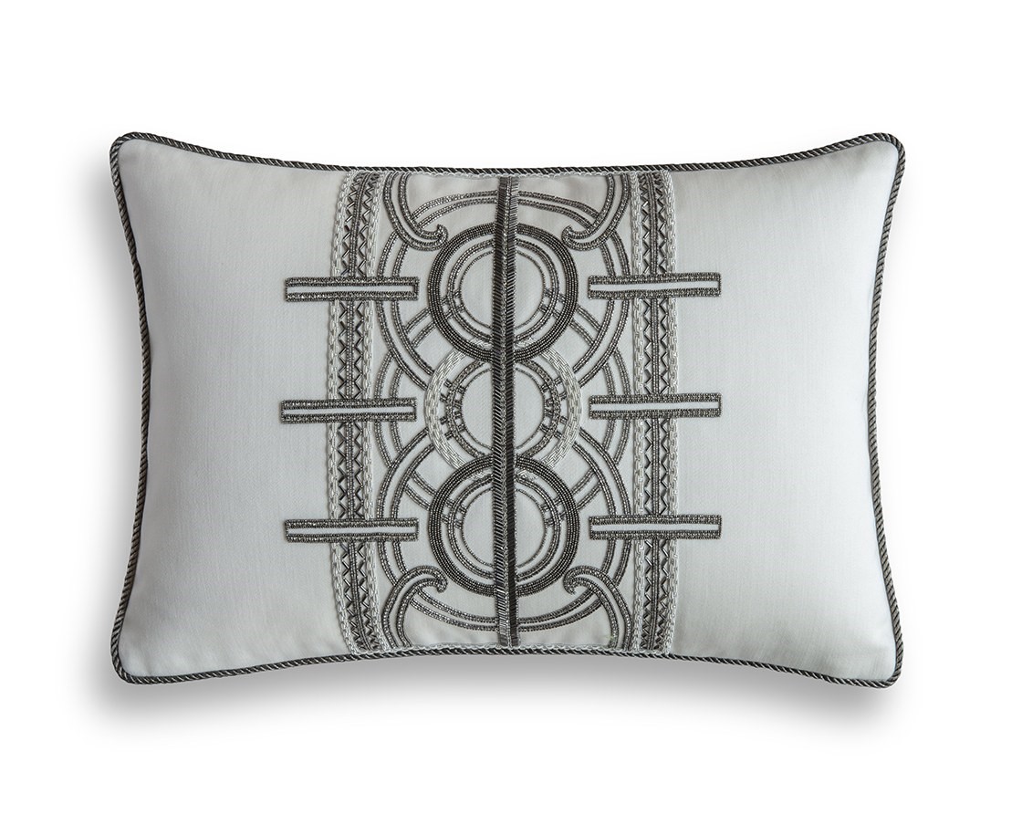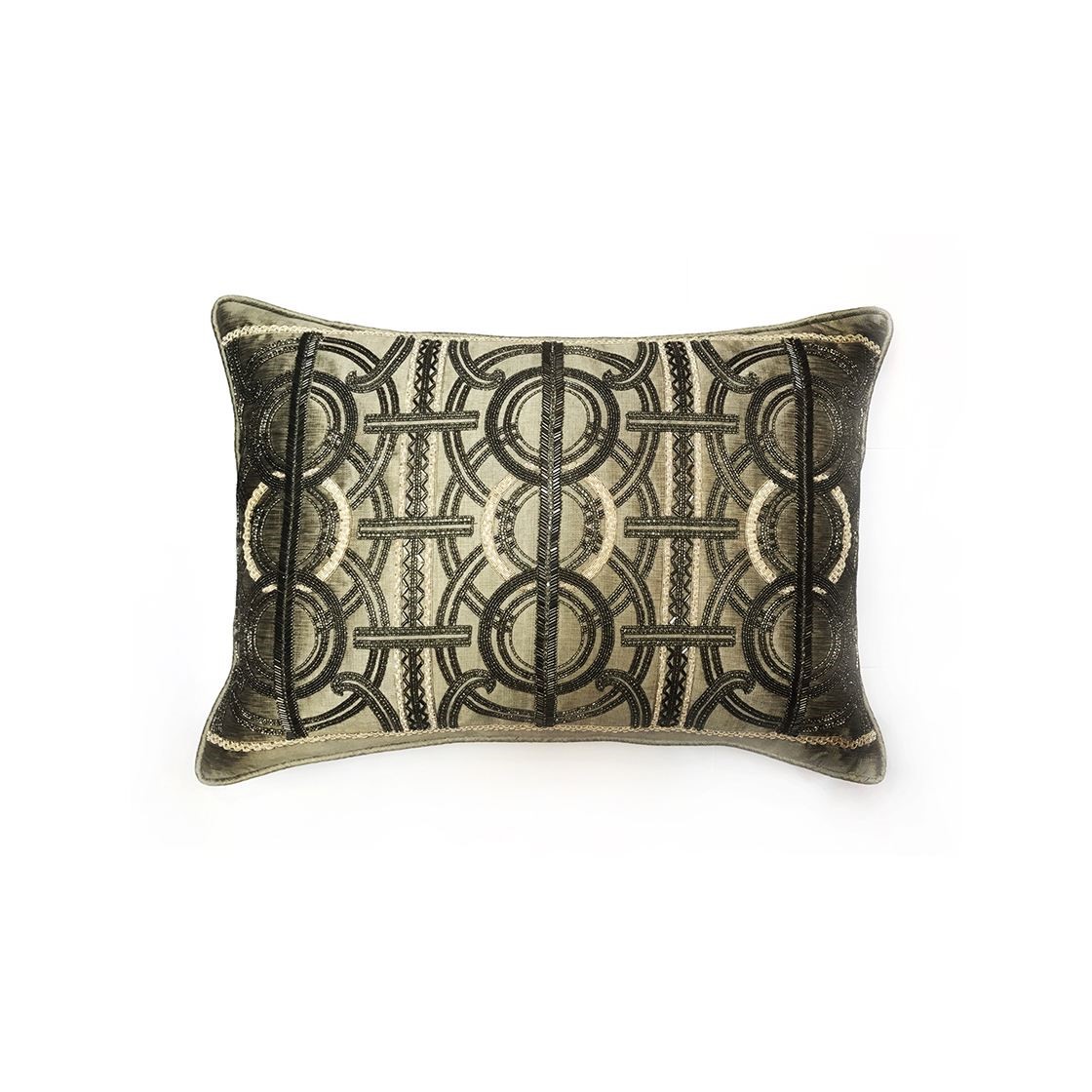 An incredibly luxurious and striking design, Circe’s pattern comprises of concentric circles and strong regimented lines for an Art Deco feel further enhanced by the beautiful hand sewn beadwork.
