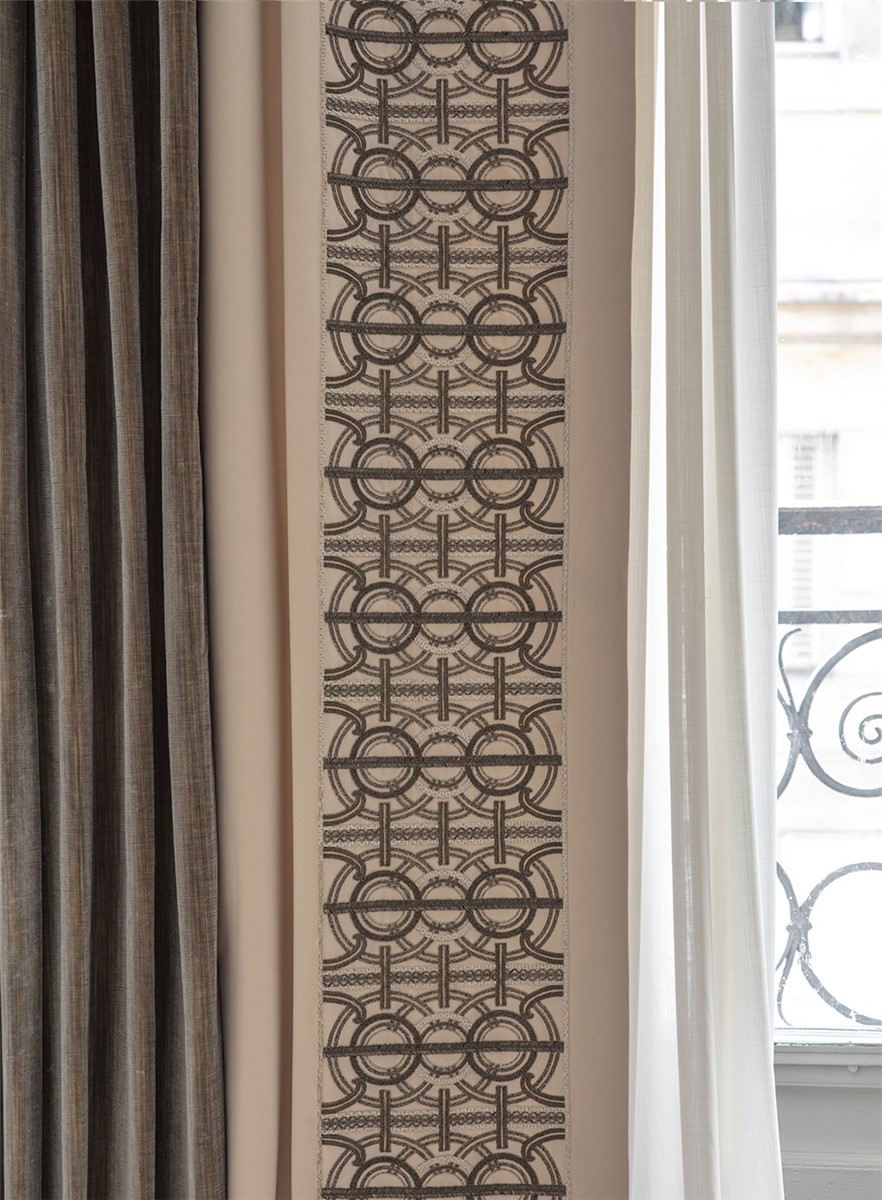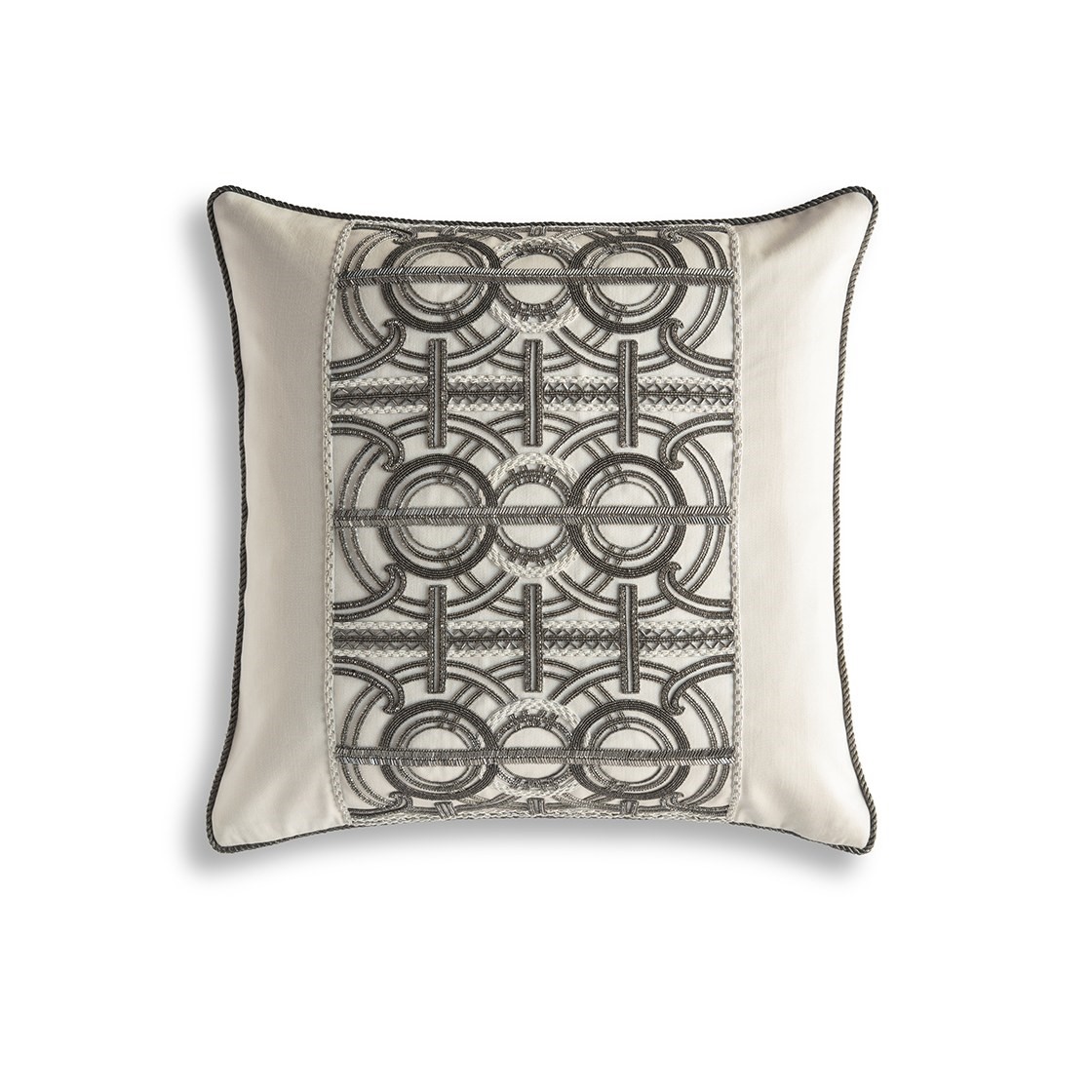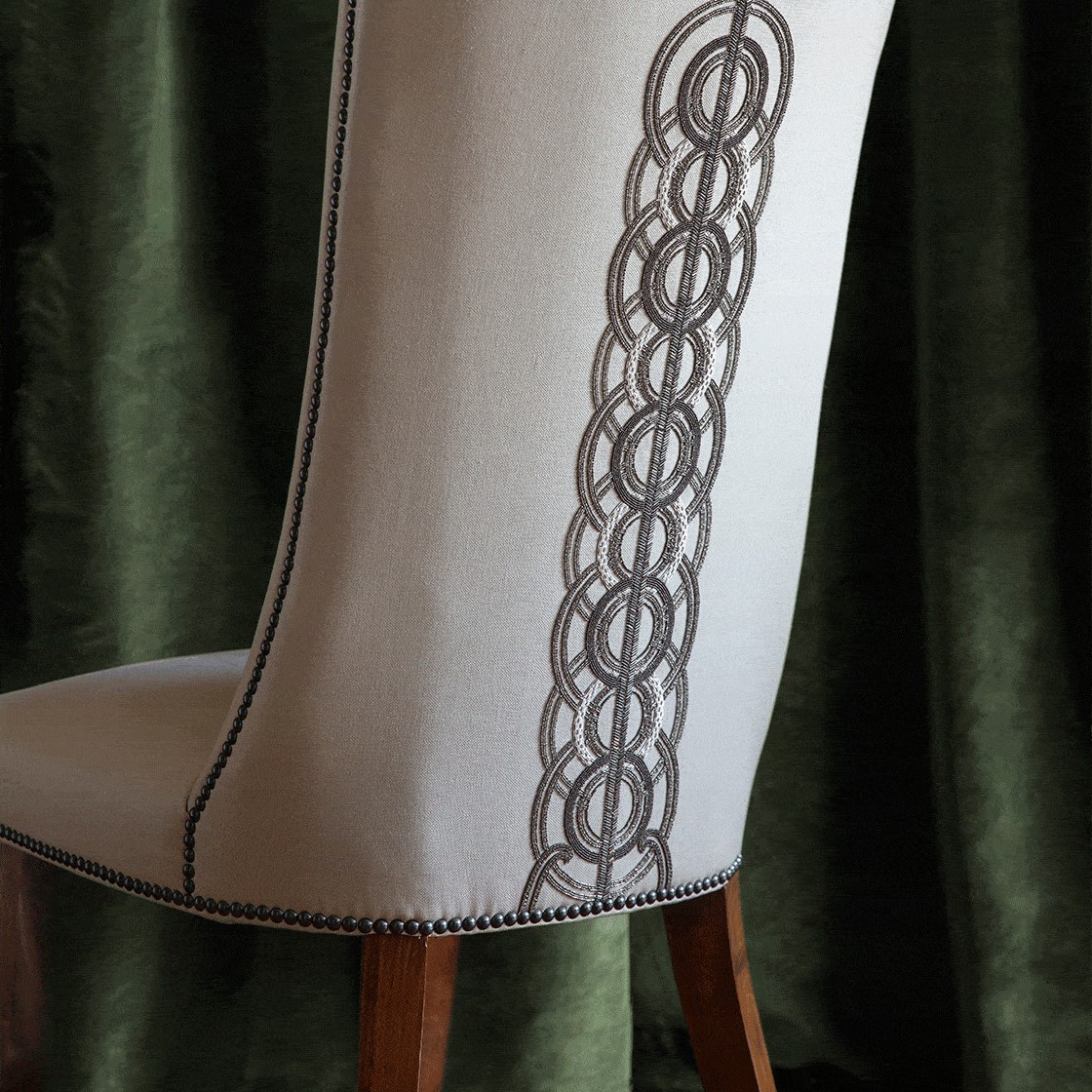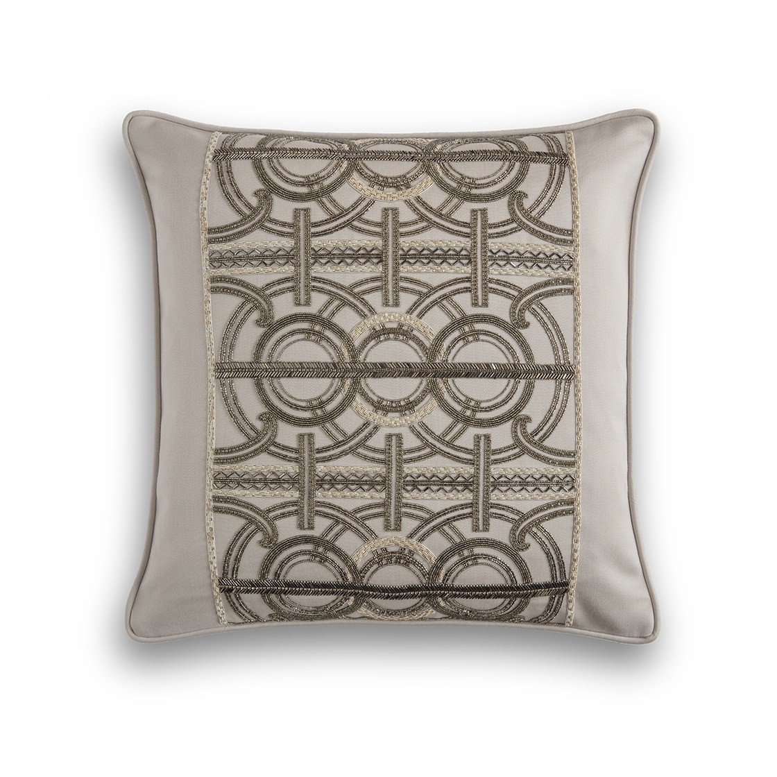 An incredibly luxurious and striking design, Circe’s pattern comprises of concentric circles and strong regimented lines for an Art Deco feel further enhanced by the beautiful hand sewn beadwork.