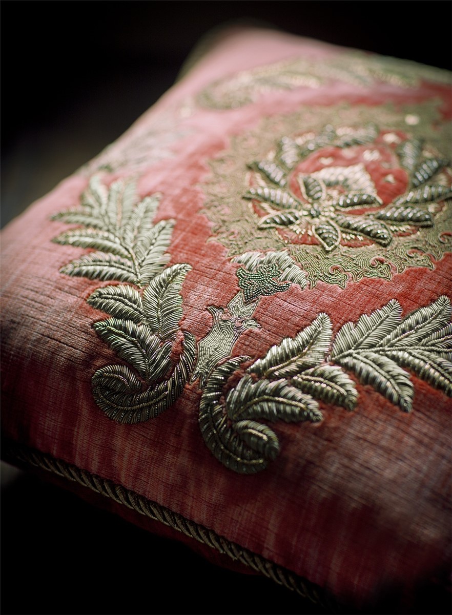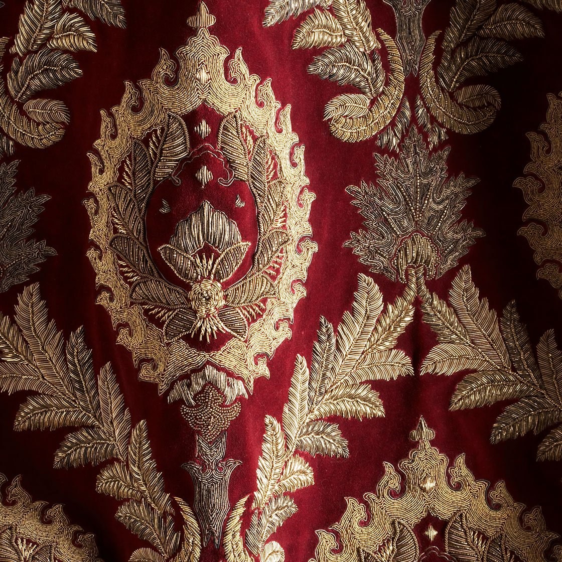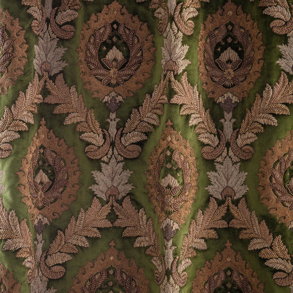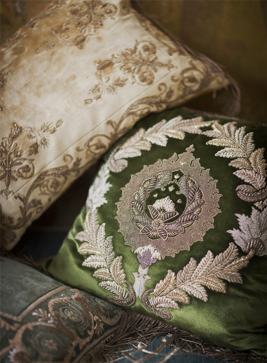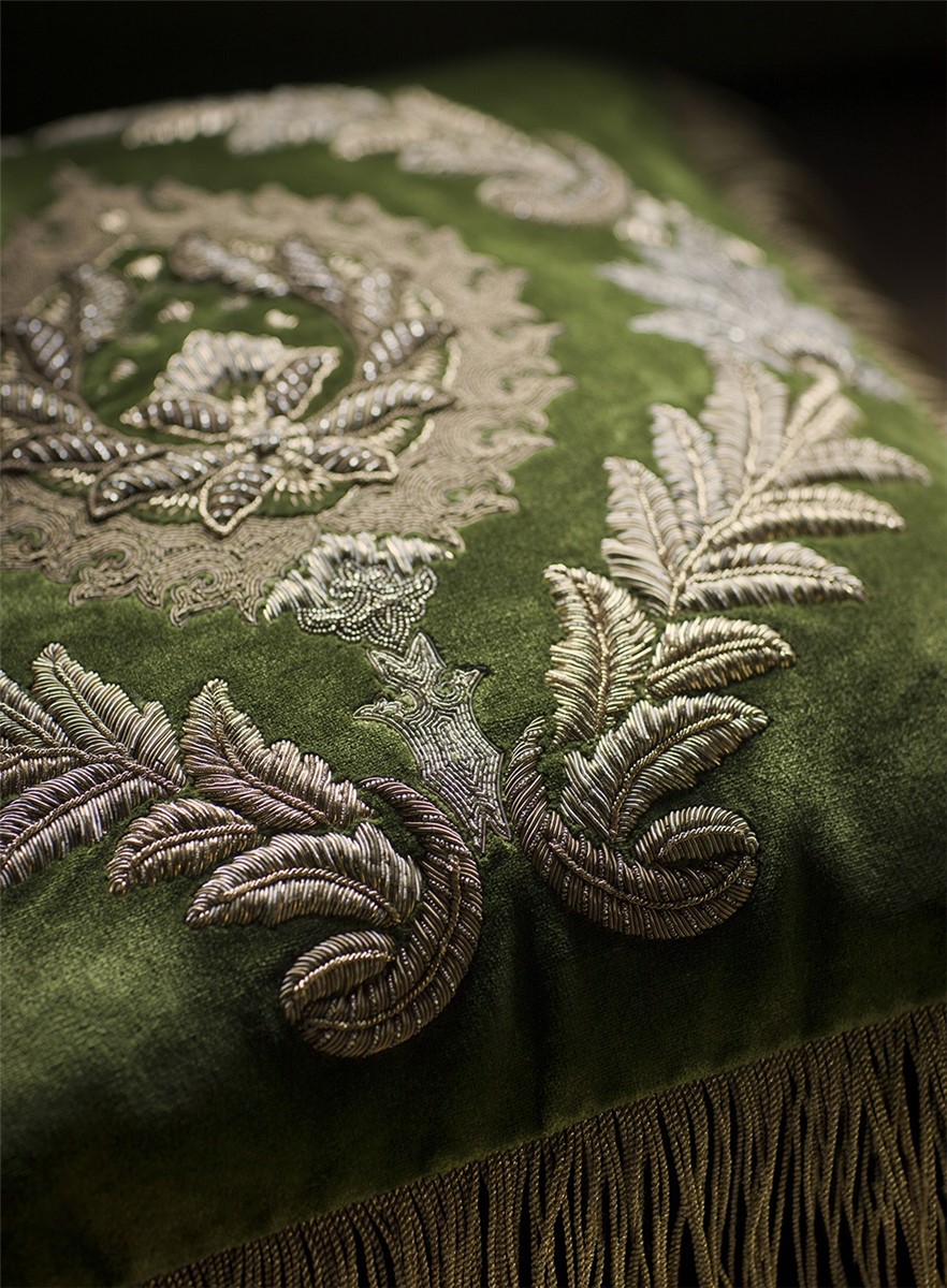 Rossini features a large detailed damask pattern that oozes sumptuous opulence. Embroidered in high relief in antiqued silver and gold threads, it adds theatrical elegance to any space.