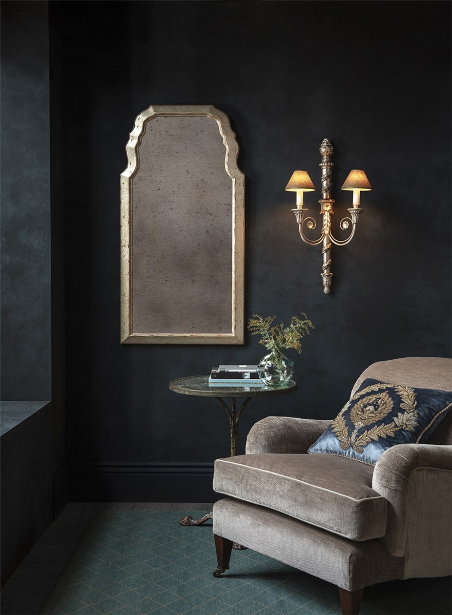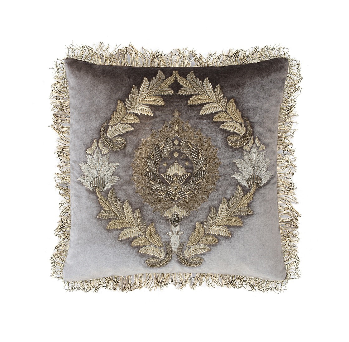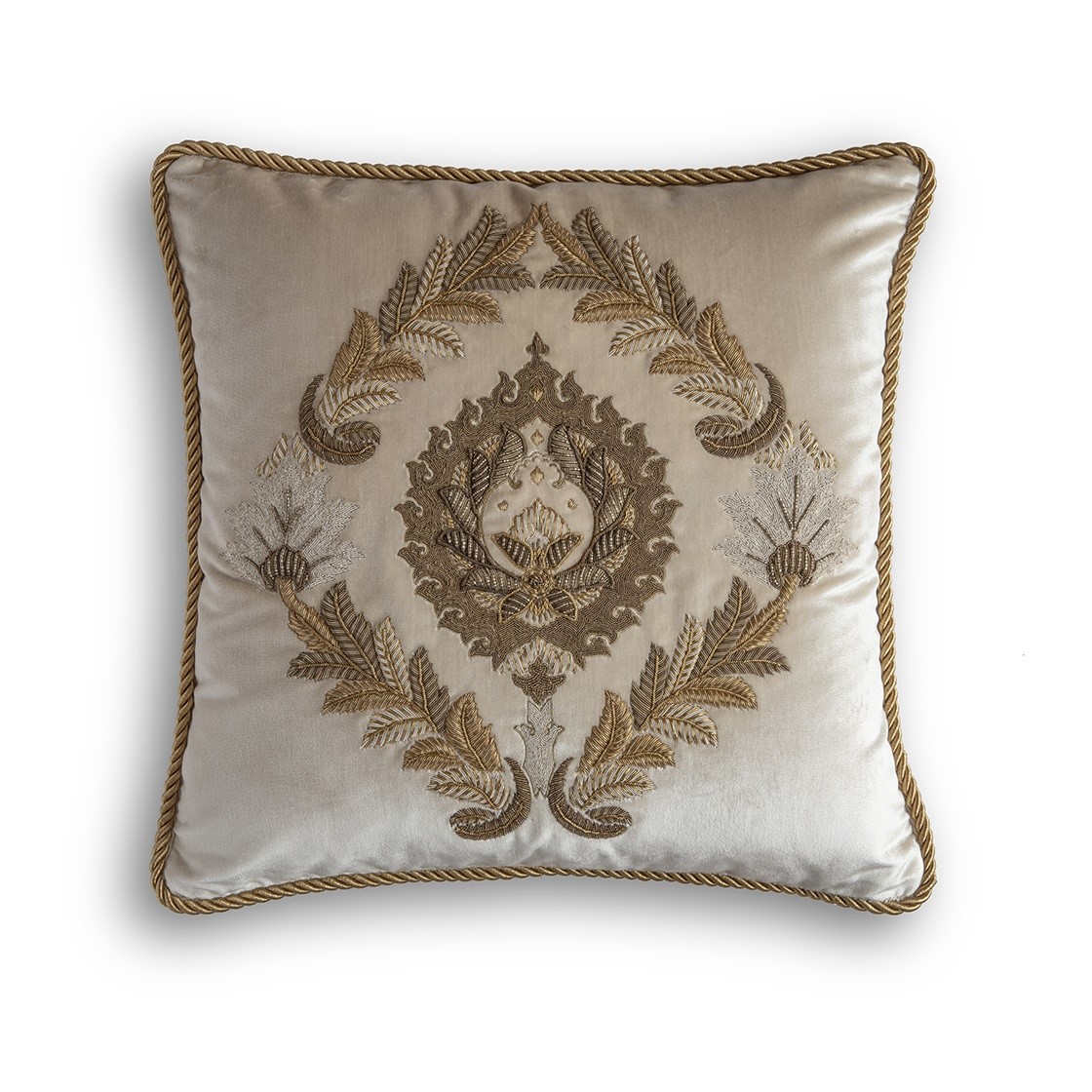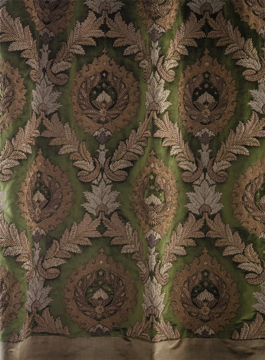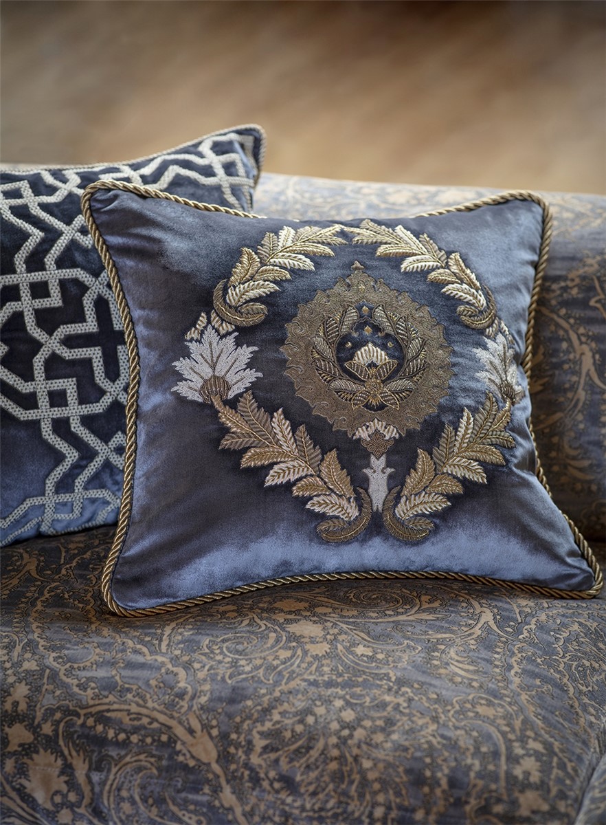 Rossini features a large detailed damask pattern that oozes sumptuous opulence. Embroidered in high relief in antiqued silver and gold threads, it adds theatrical elegance to any space.