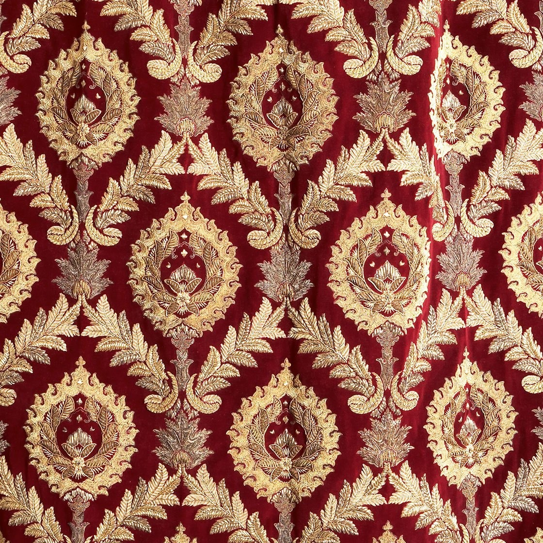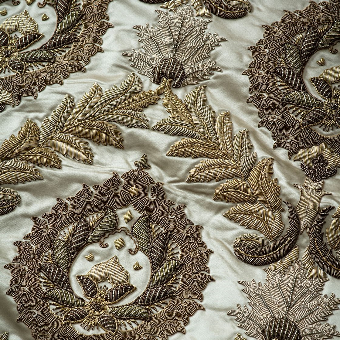 Our Couture fabrics are bespoke and hand embroidered to order. They can be created in fine gold or silver silk thread and embellished with freshwater pearls and semi-precious stones. Each pattern can be coloured and designed to fit your needs. We can embroider onto any background fabric including: silk, velvet, organza and leather.