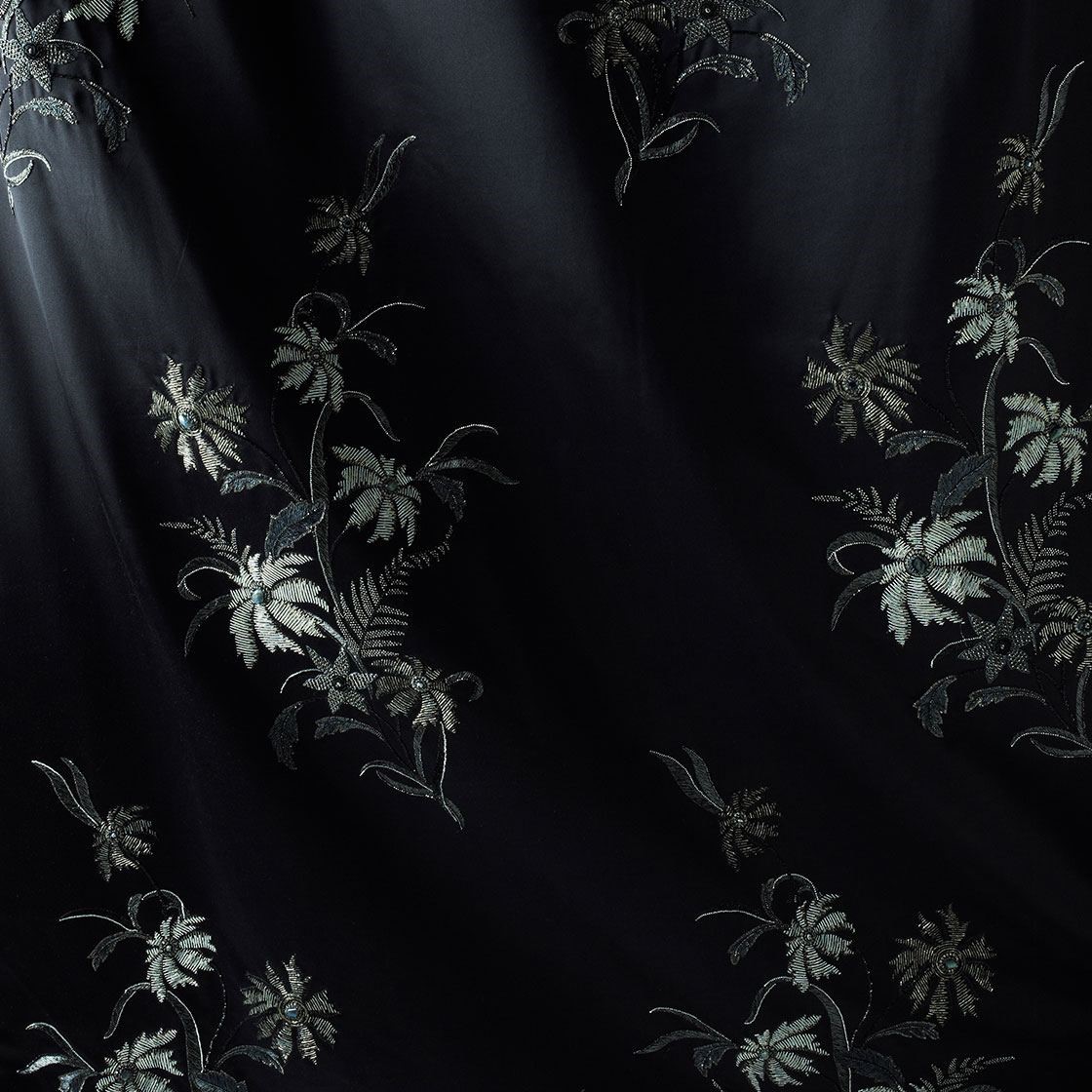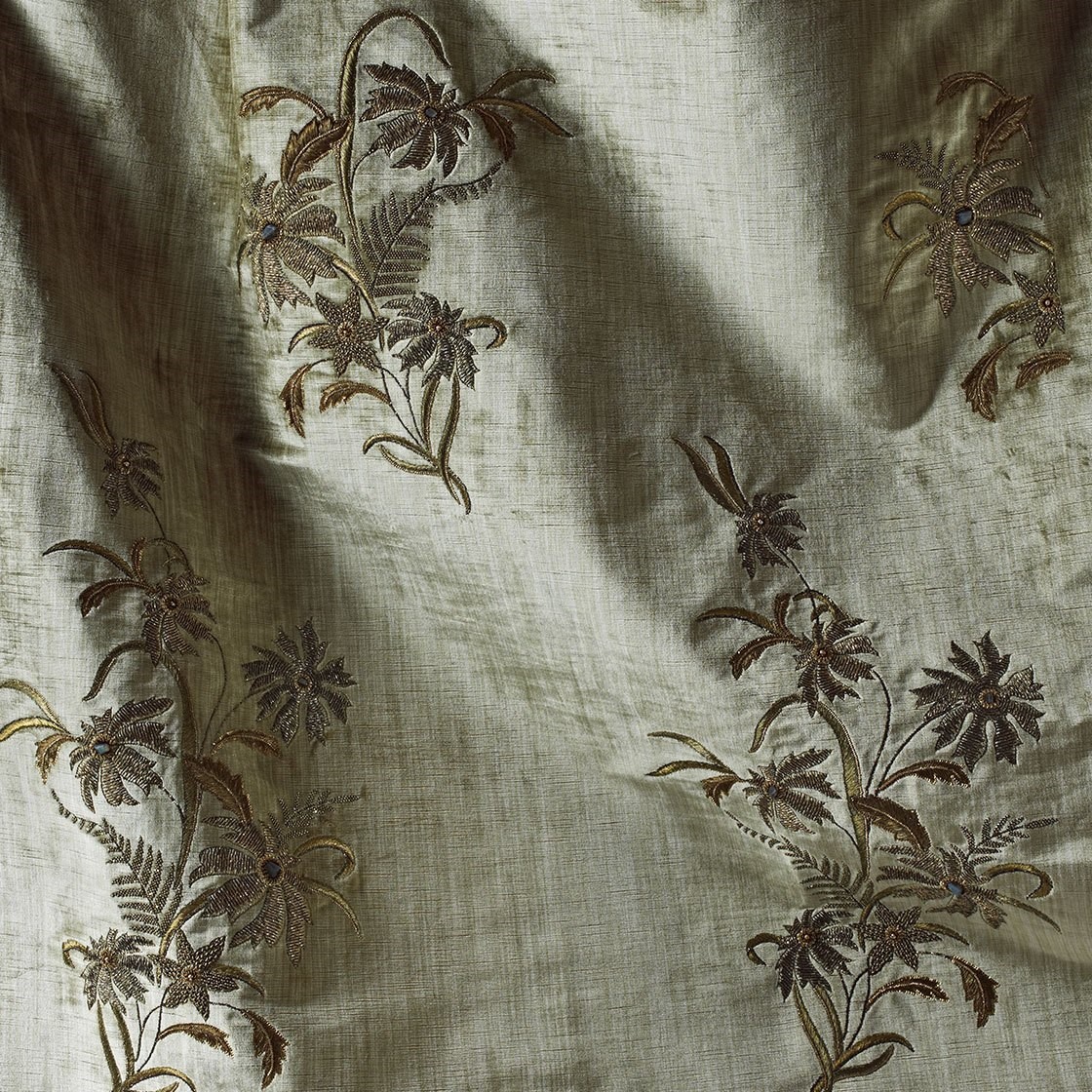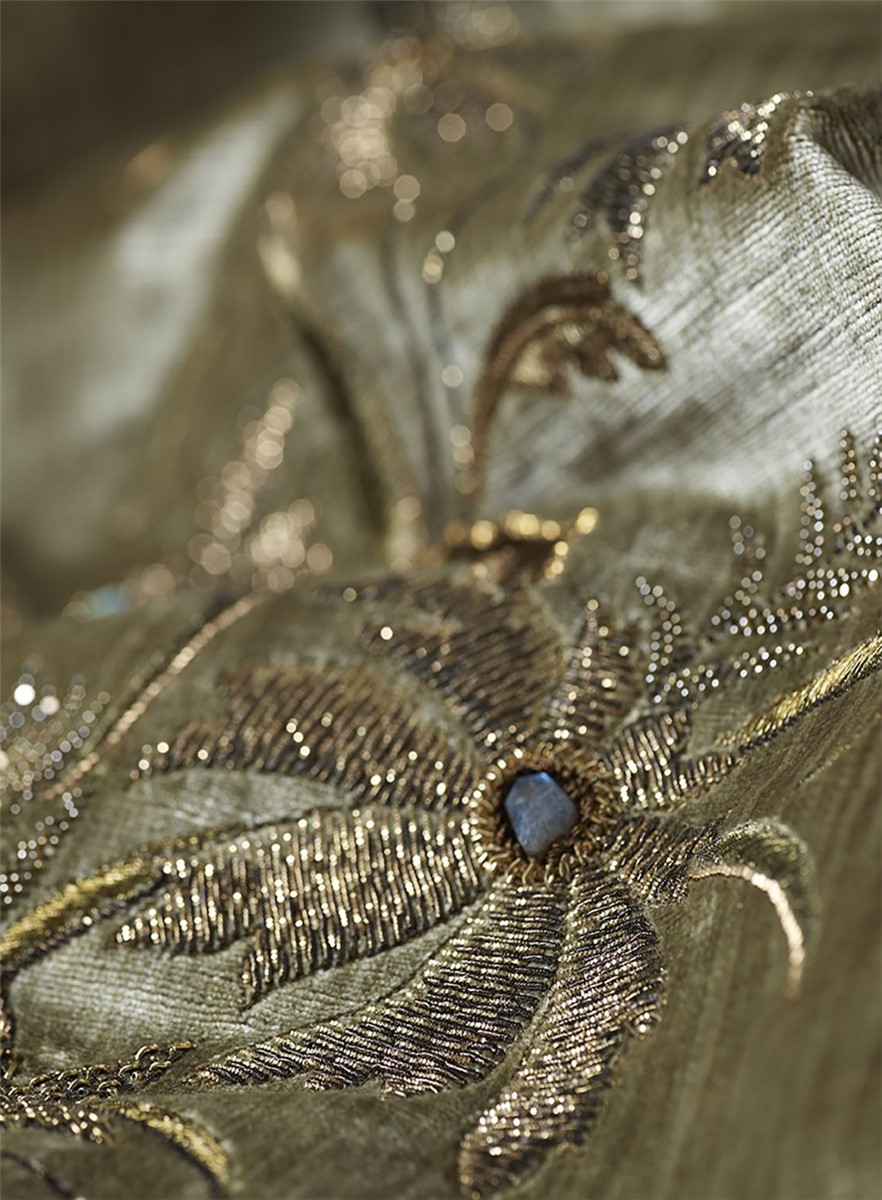 Our Couture fabrics are bespoke and hand embroidered to order. They can be created in fine gold or silver silk thread and embellished with freshwater pearls and semi-precious stones. Each pattern can be coloured and designed to fit your needs. We can embroider onto any background fabric including: silk, velvet, organza and leather.| Embroidered width | 120cm |