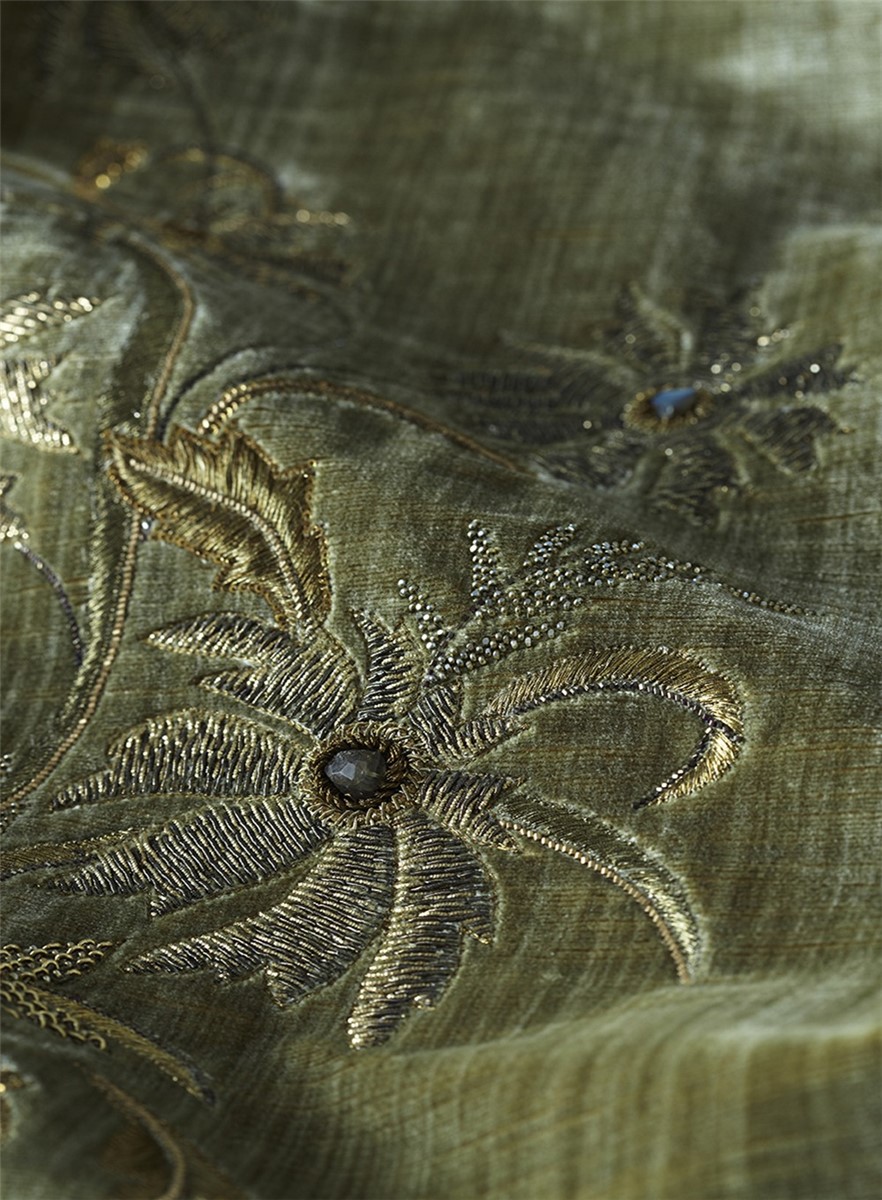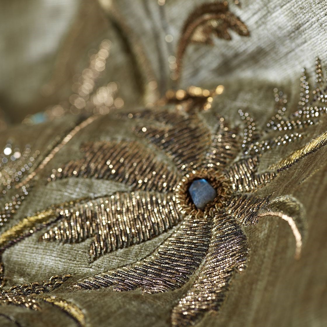 Isolde is a charming design comprising delicate posies of wildflowers. The middle of each flower holds an uncut semiprecious stone, while each petal is delicately worked in metal thread.