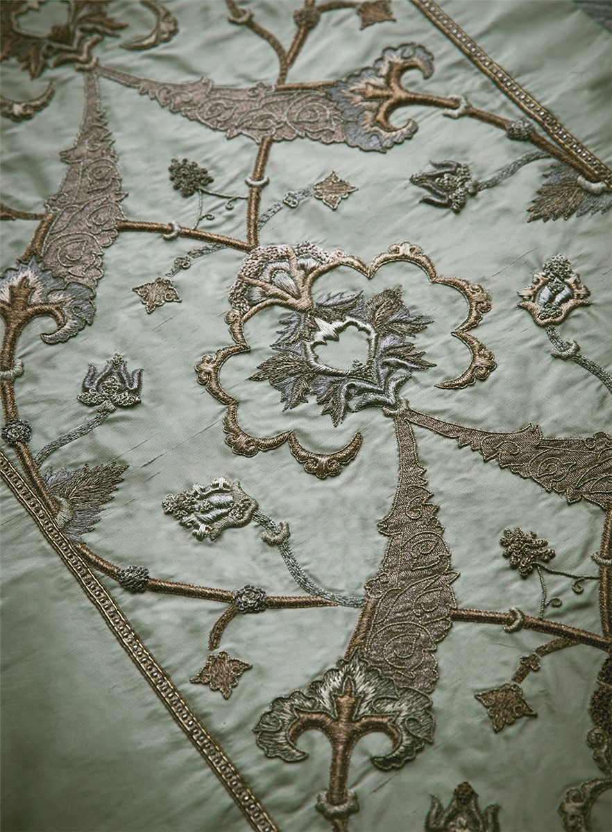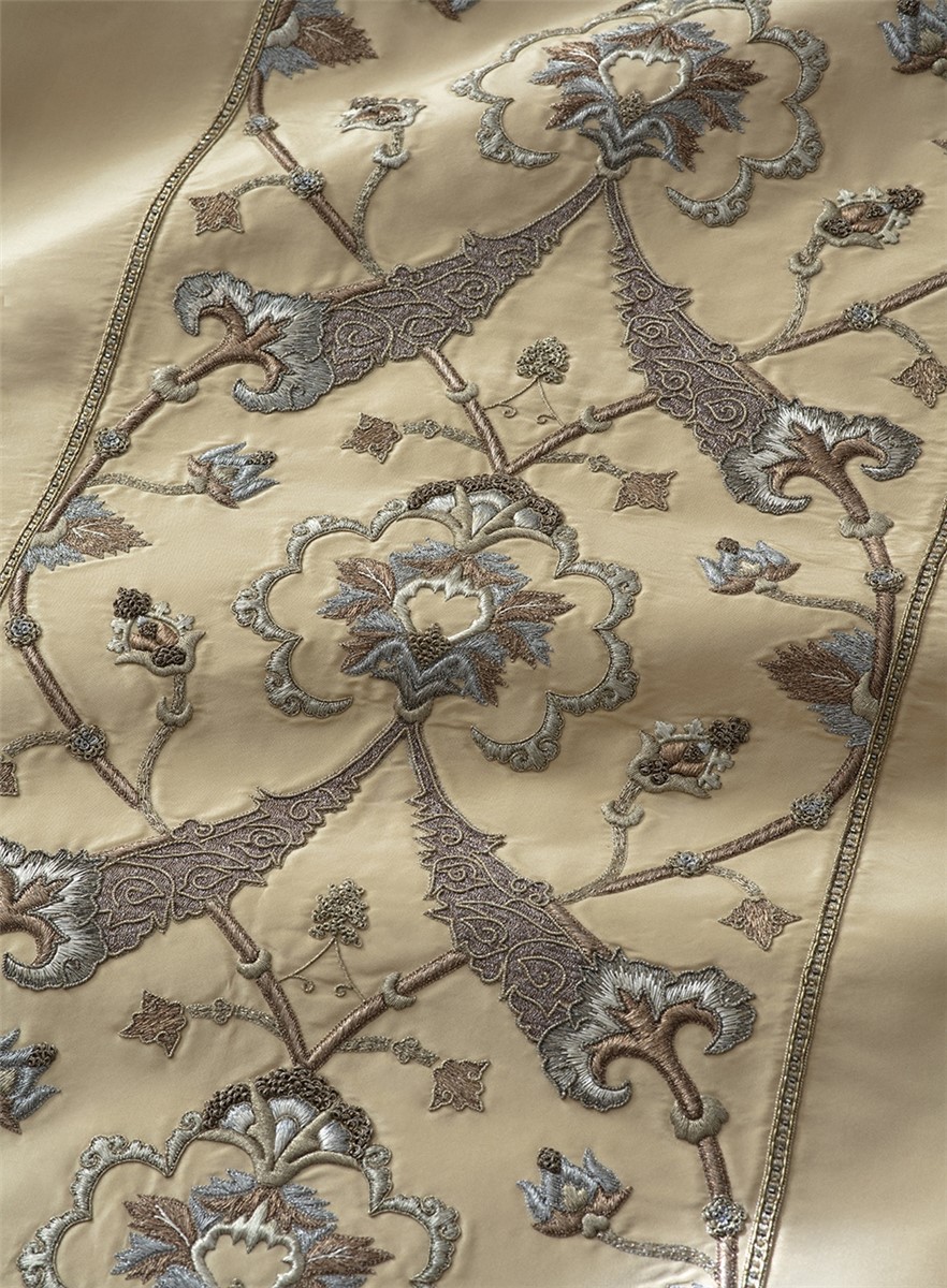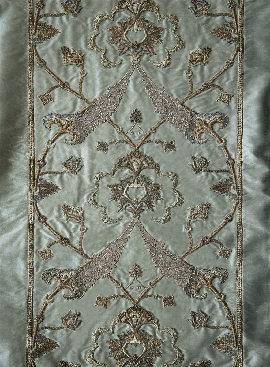 Darius is an elaborately detailed embroidery inspired by the tapestries of the Ottoman Empire. The design works as a leading edge on curtains, or on the back of dining chairs and scatter cushions.