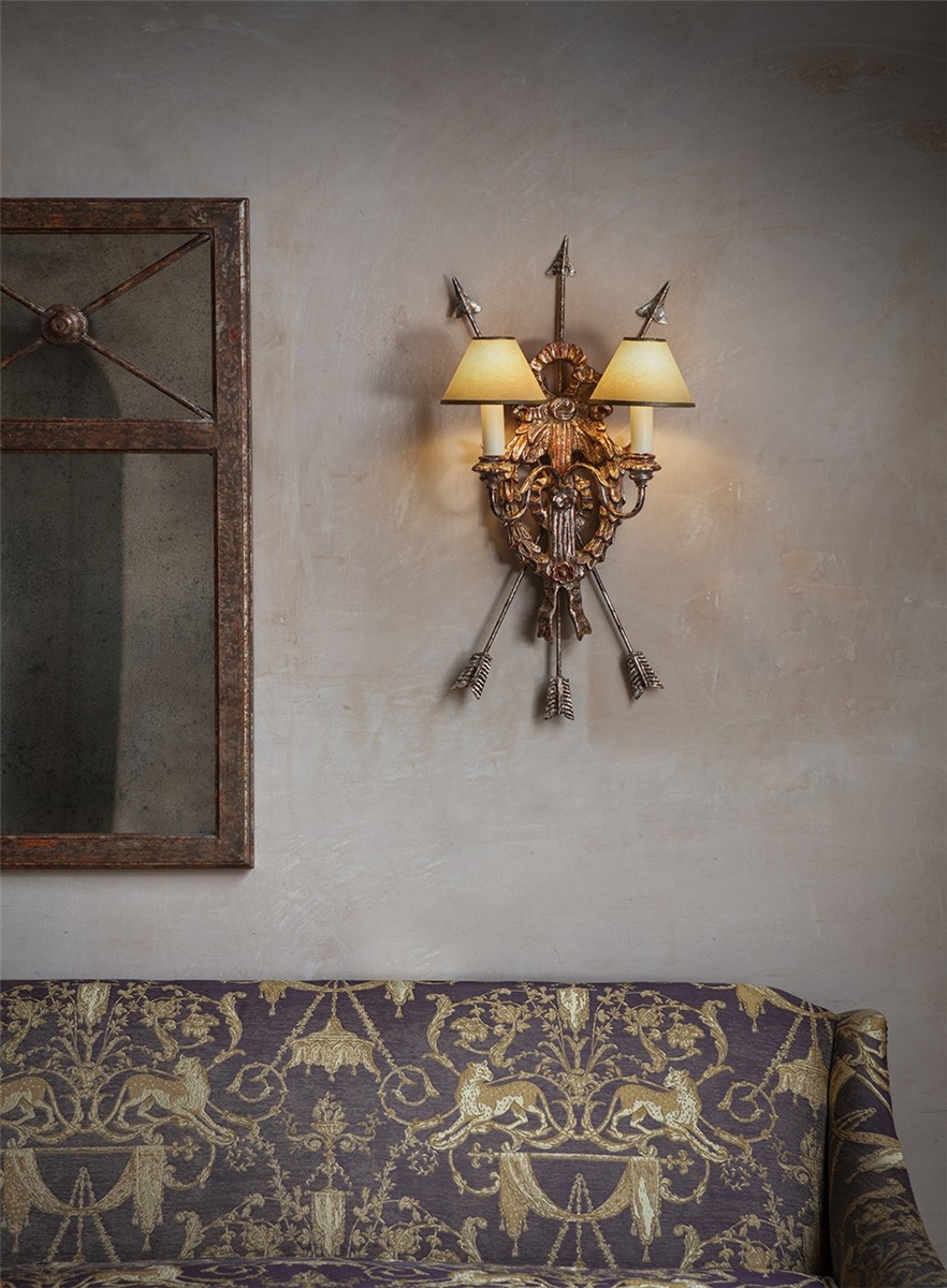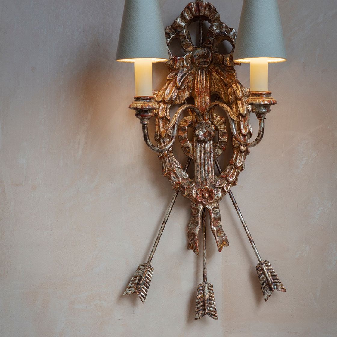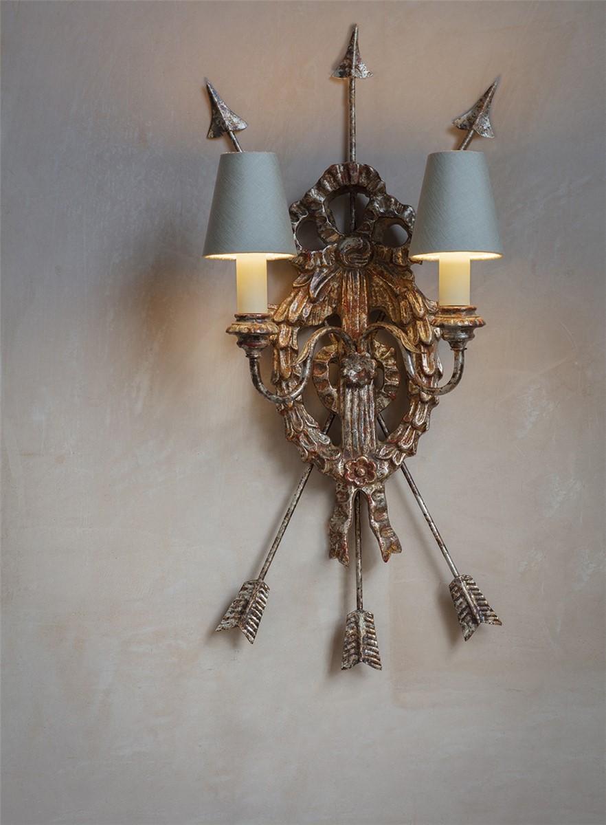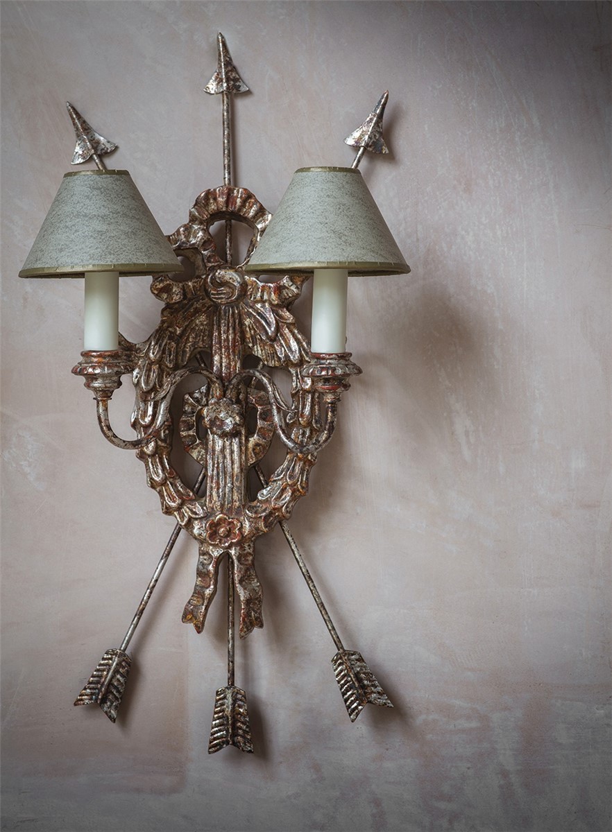 This is a decorative two-branch wall light. Its intricate design includes a hoop of richly carved leaves suspended from a ribbon bow and elegantly framed by a clutch of arrows.