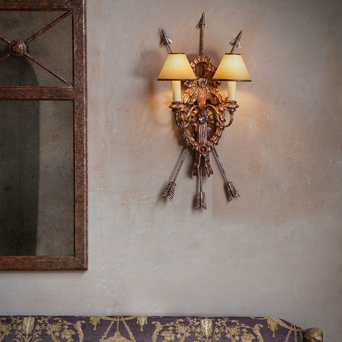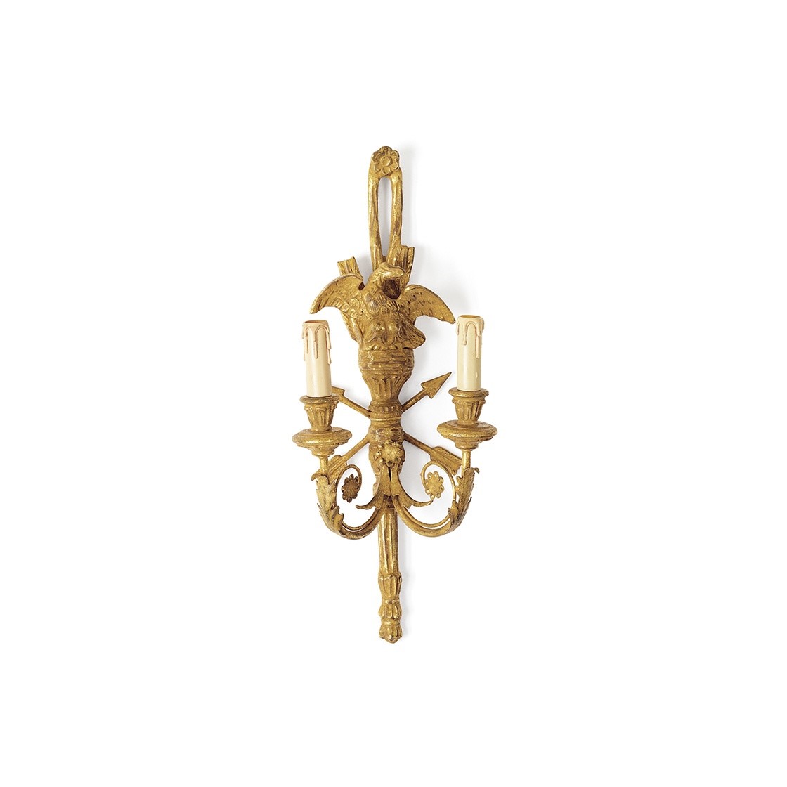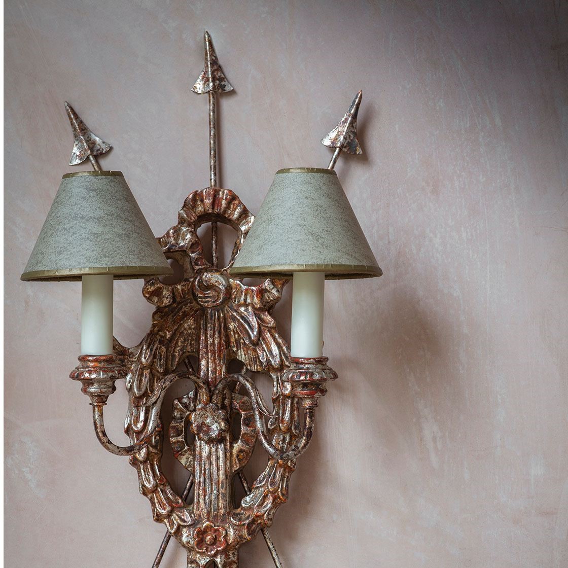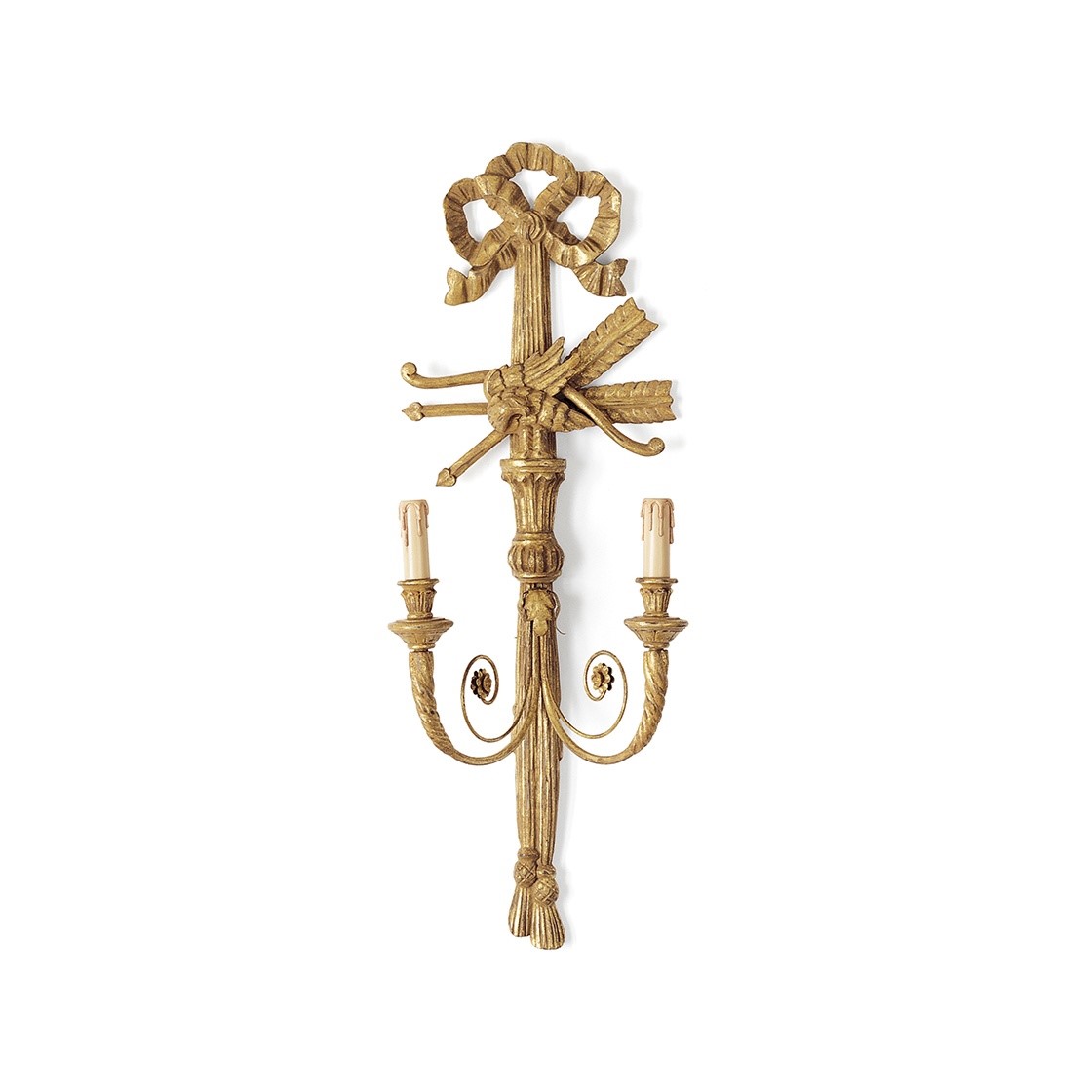 This is a decorative two-branch wall light. Its intricate design includes a hoop of richly carved leaves suspended from a ribbon bow and elegantly framed by a clutch of arrows.