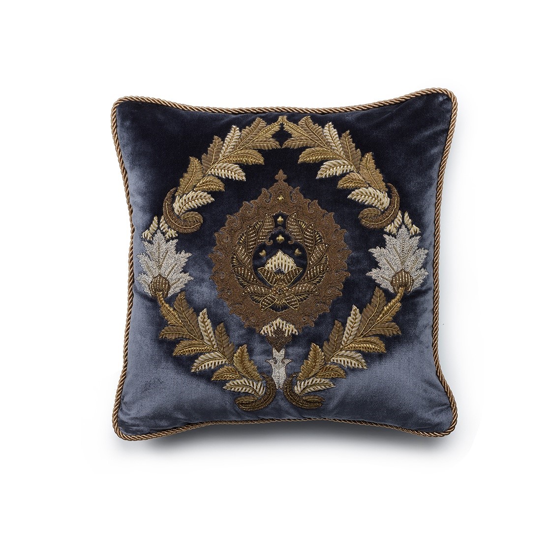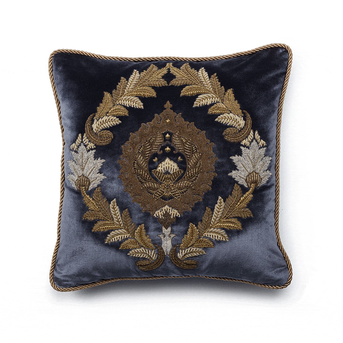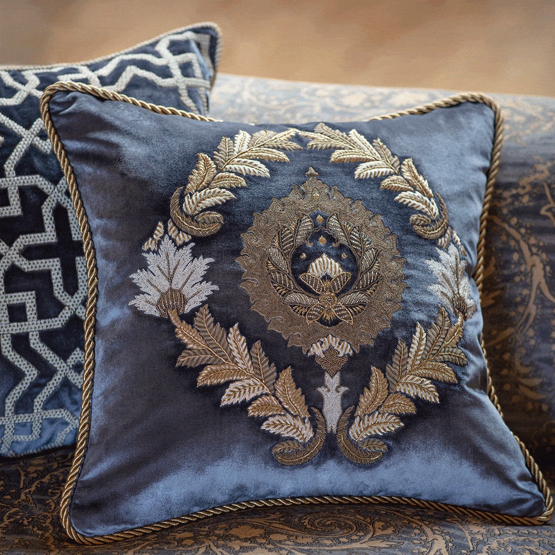 Our Couture cushions are bespoke and hand embroidered to order. They can be created in fine gold or silver silk thread and embellished with freshwater pearls and semi-precious stones.