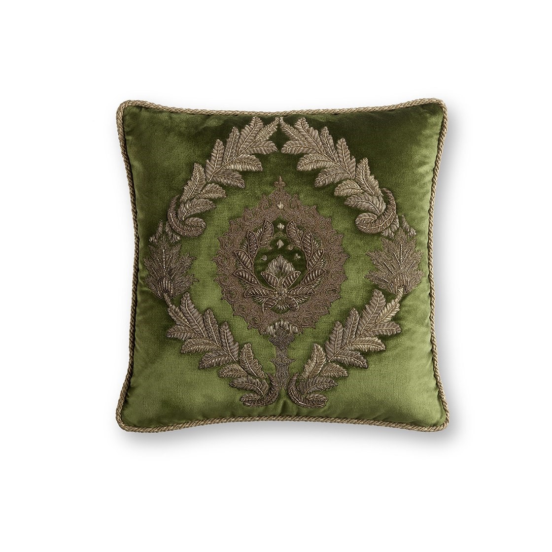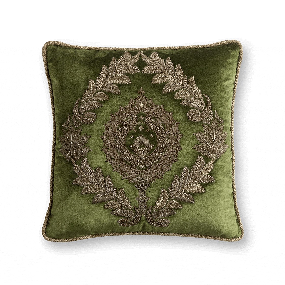 Rossini features opulently embroidered laurel wreaths surrounding the finely worked central motif in subtly aged gold and silver thread.