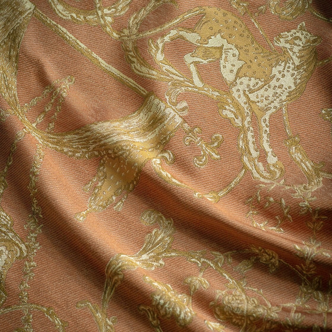 Inspired by Georgian designs, our Lawrence fabric is an inspirational weave depicting cheetahs prowling elegantly through twirling lanterns, scrolls and tassels.