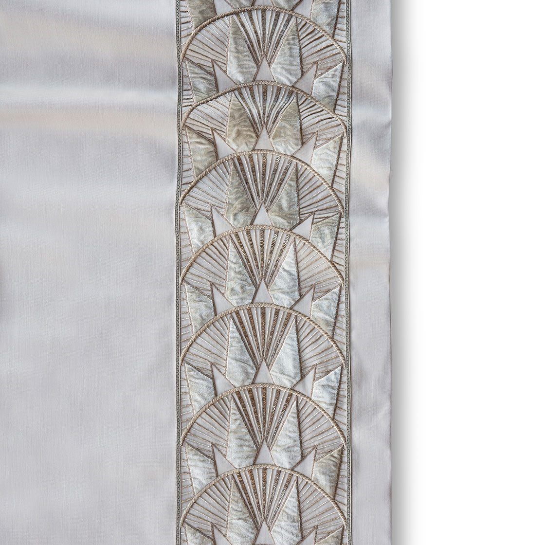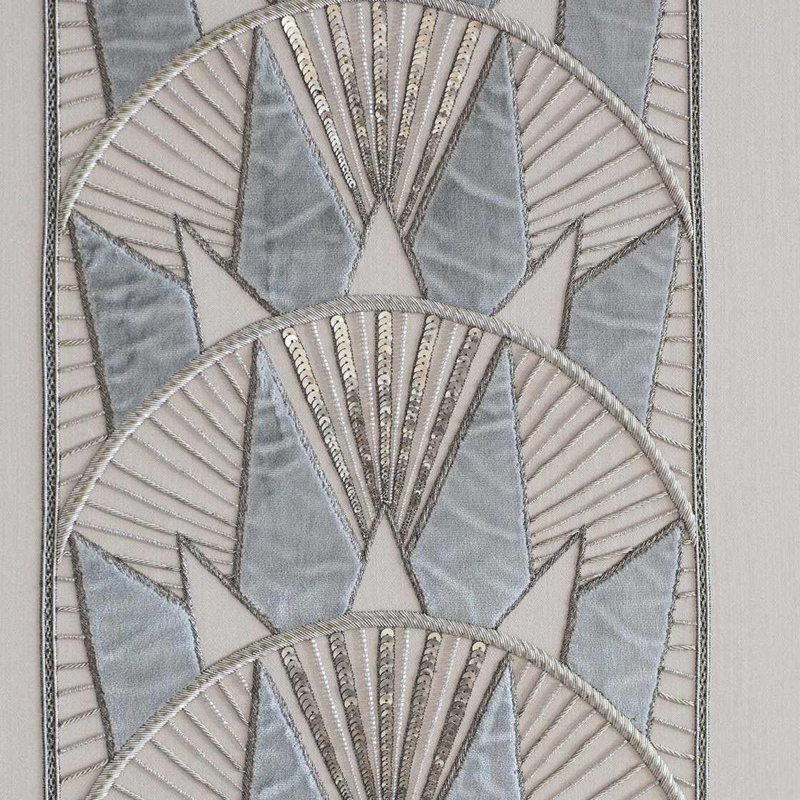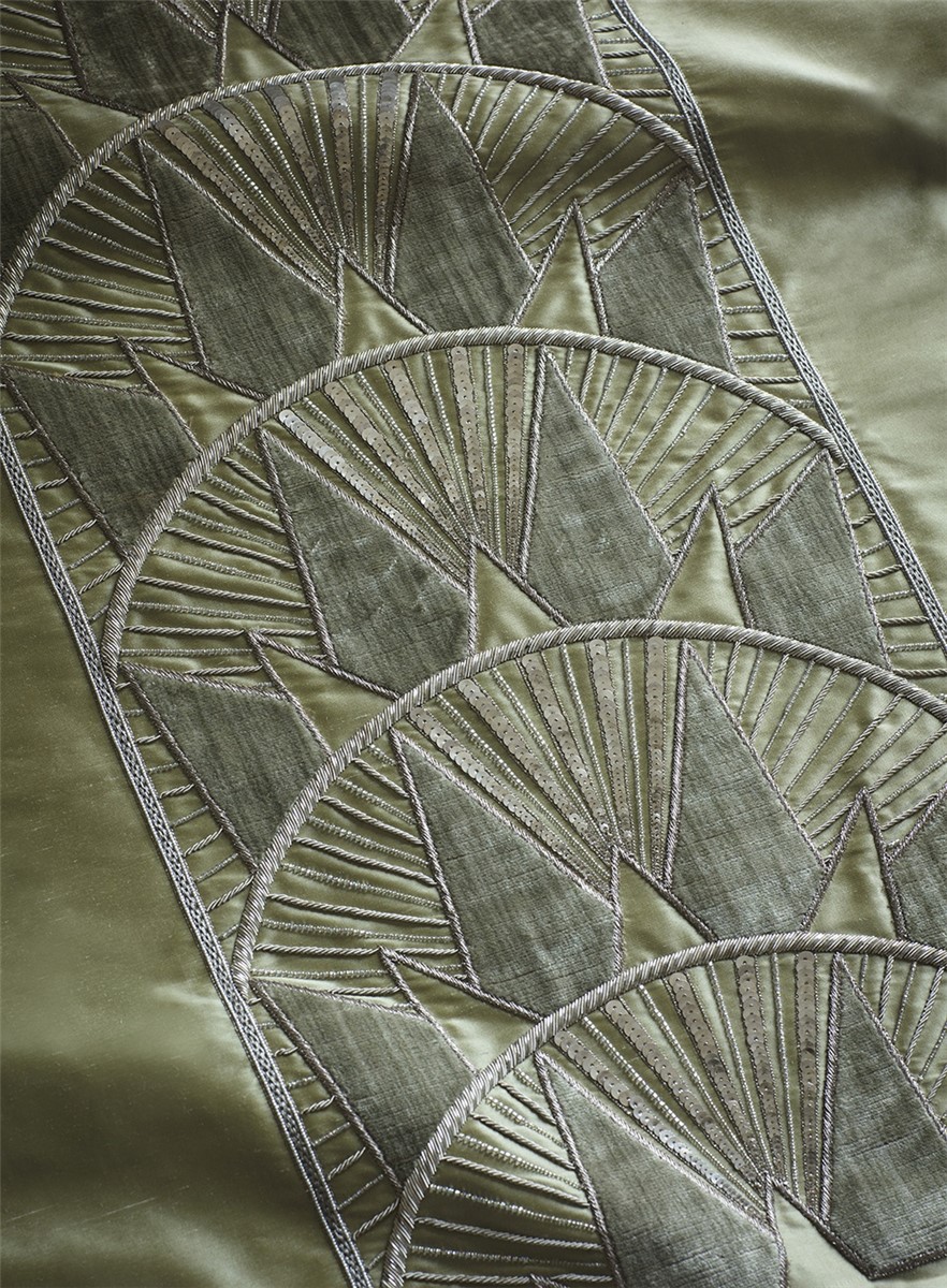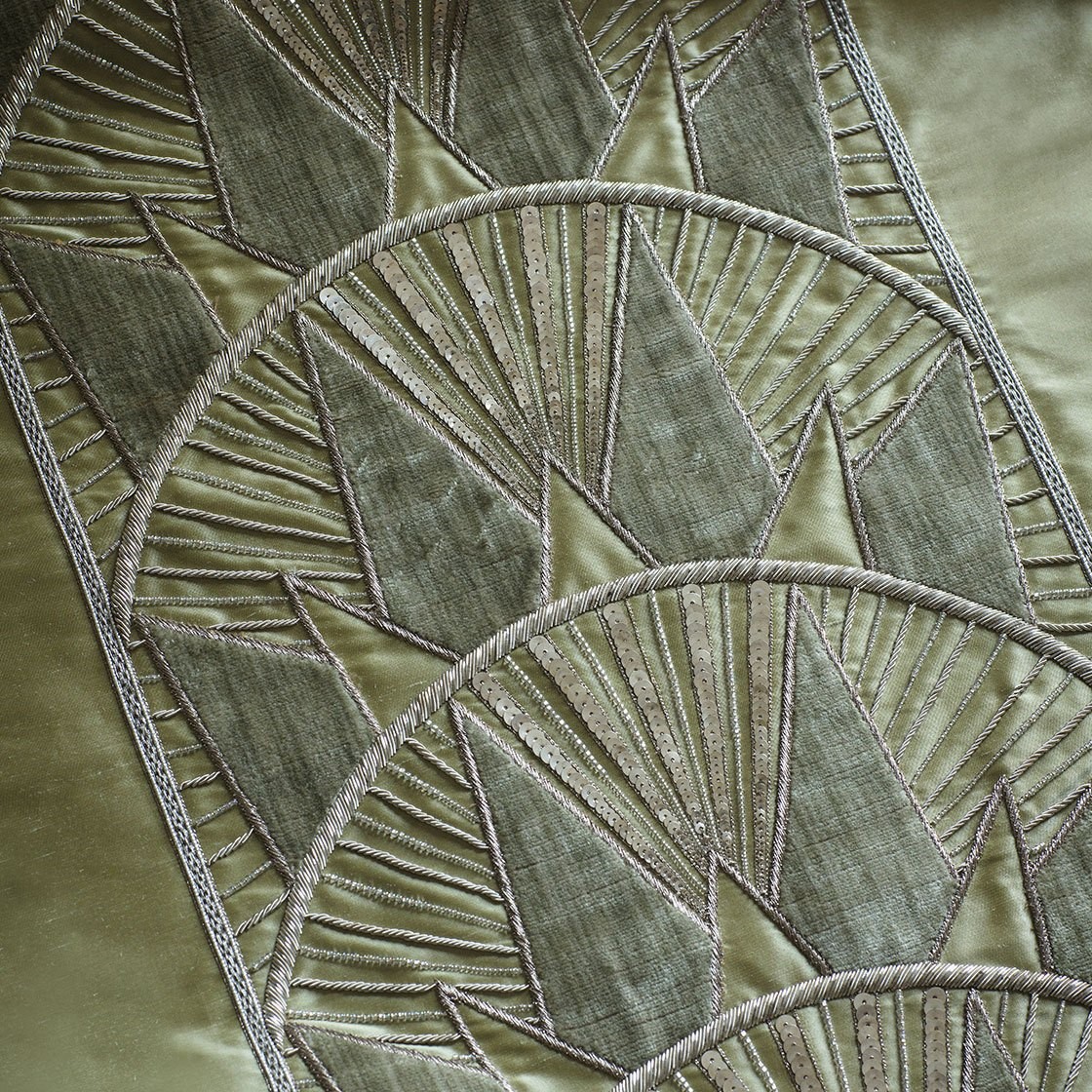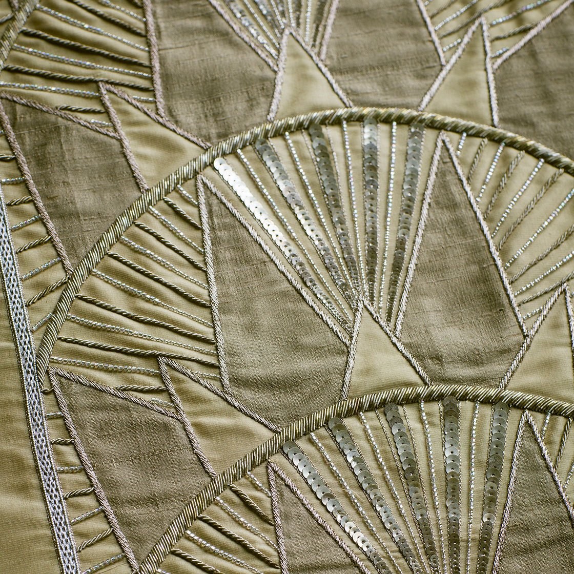 Inspired by the Art Deco era and the New York skyline, Rockefeller is a striking border design embroidered in metallic threads with contrasting applique fabric in silk or velvet.