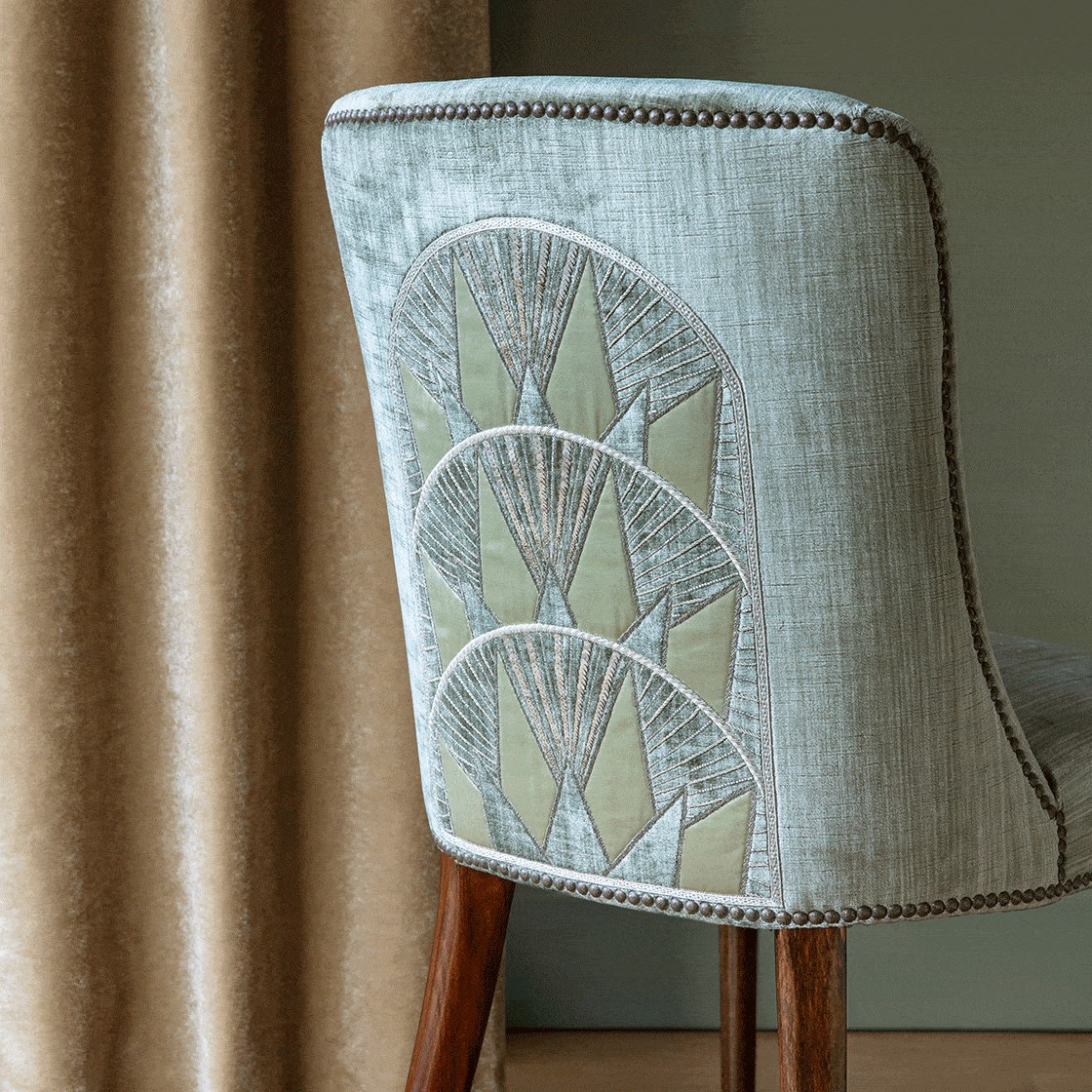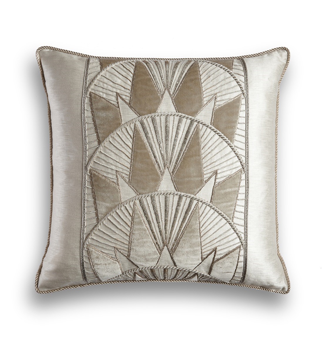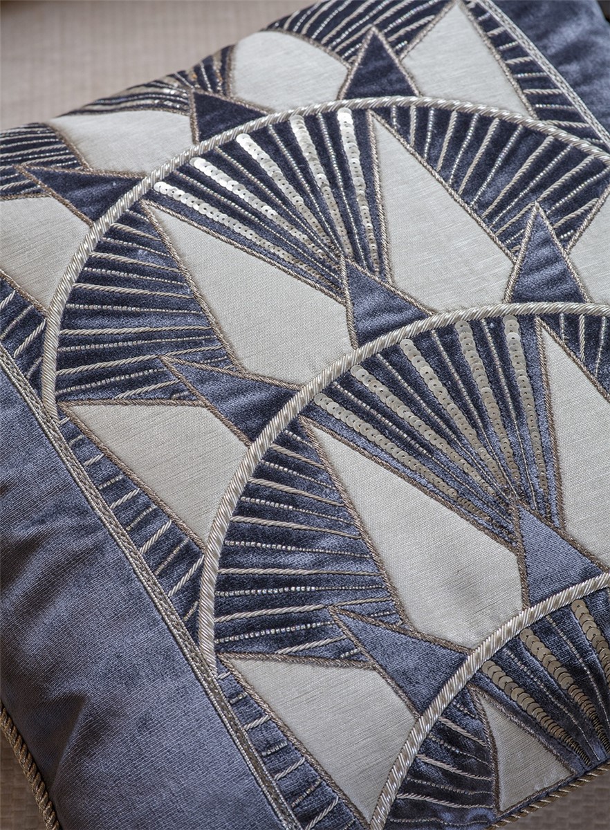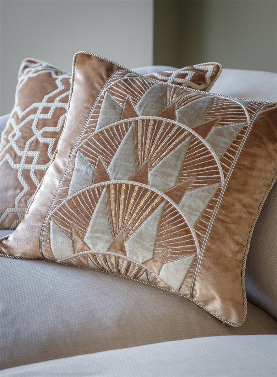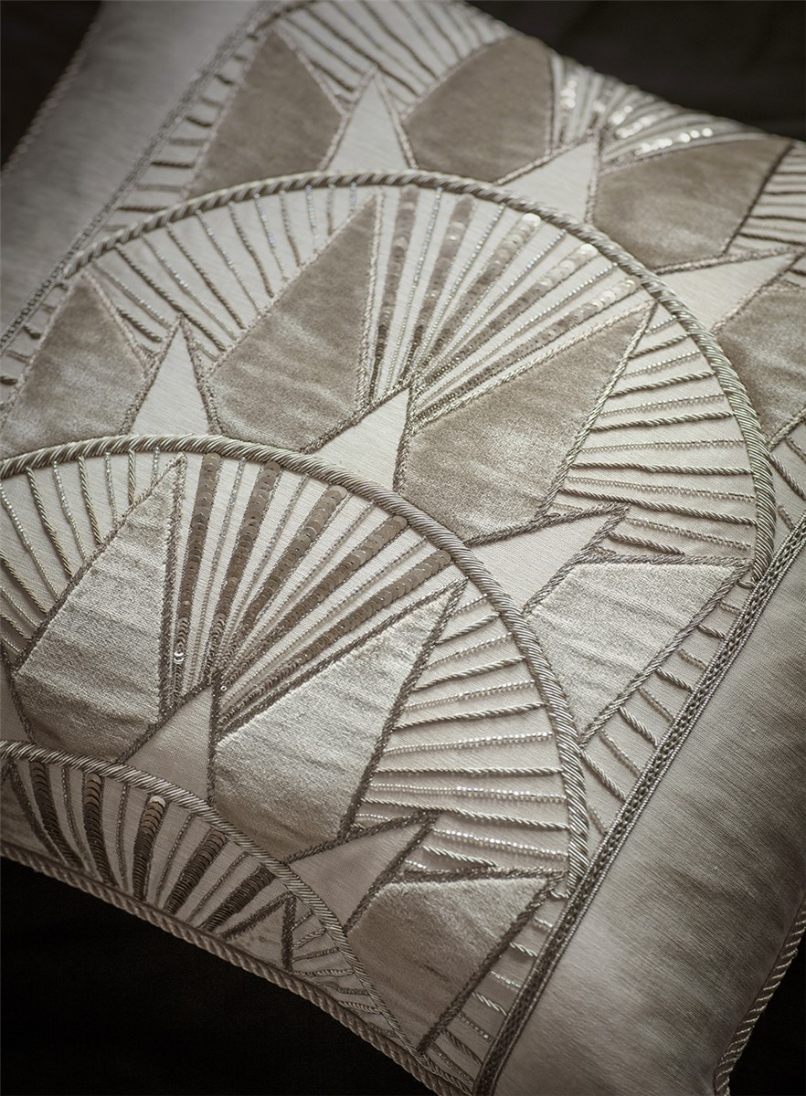 Inspired by the Art Deco era and the New York skyline, Rockefeller is a striking border design embroidered in metallic threads with contrasting applique fabric in silk or velvet.