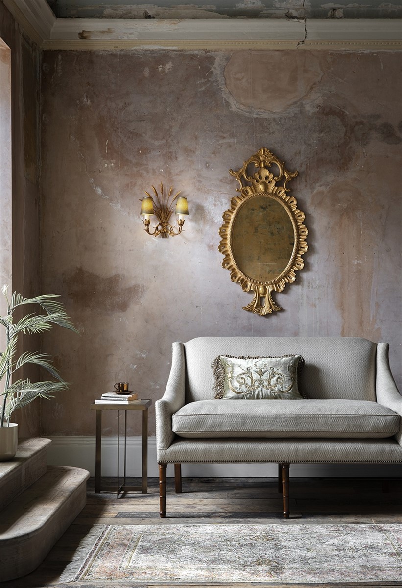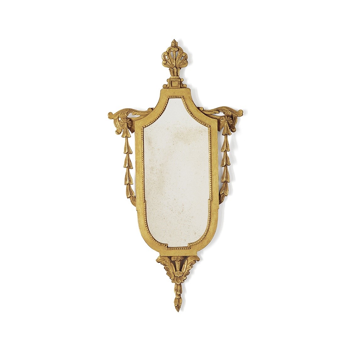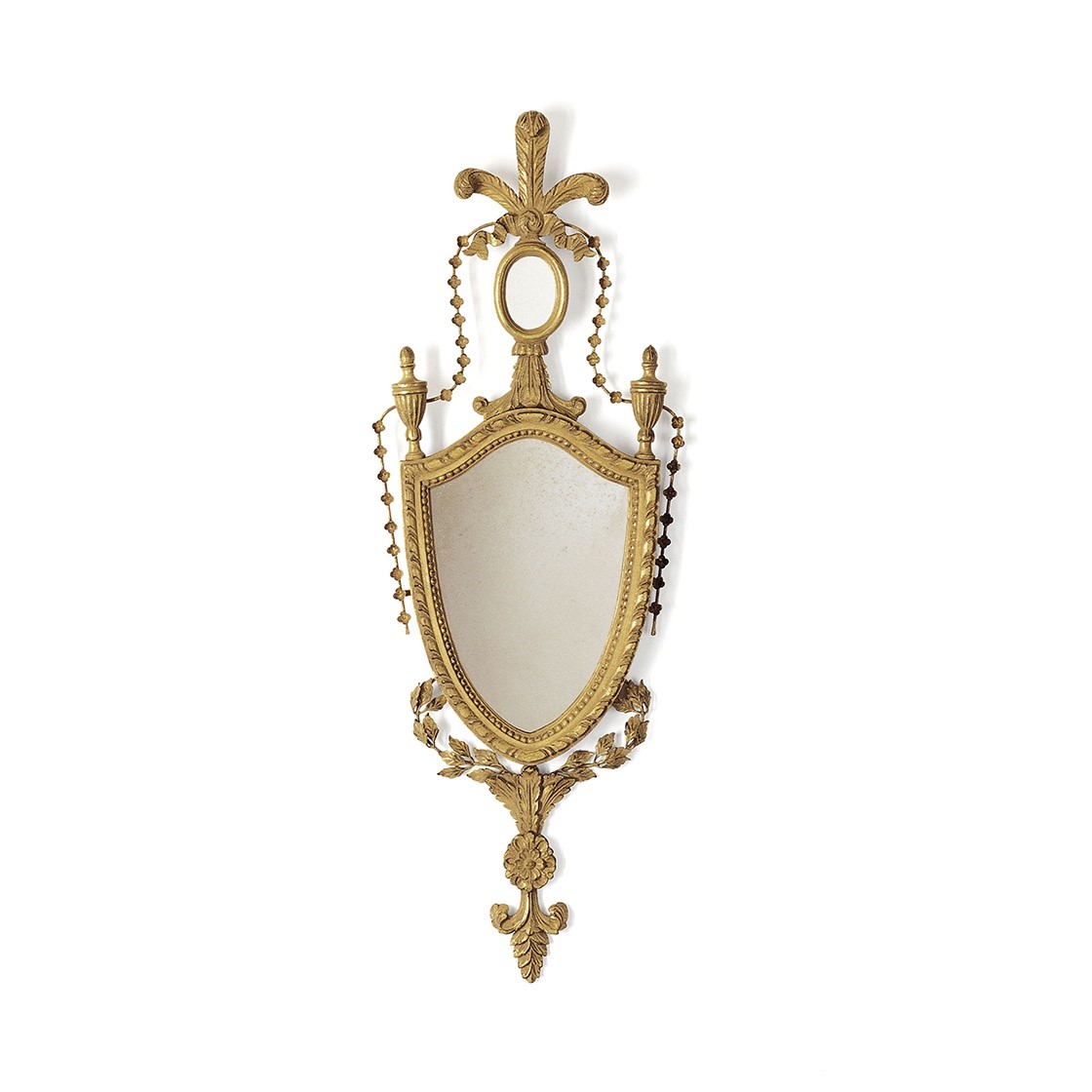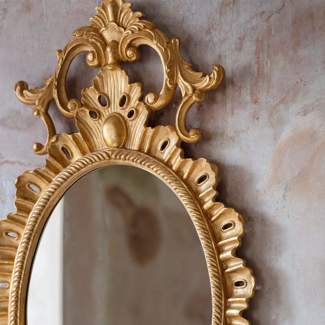 A formal oval mirror in an early Georgian style, the Belgrave has a rich but restrained decorative design, surmounted by an arch of giltwood scrolls and foliage.
