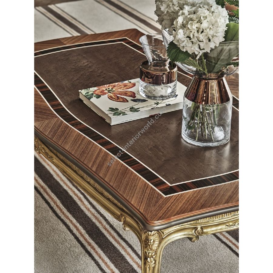 This exquisite coffee table showcases an intricate inlay made from Canaletto walnut, erable, ebony, and maple, reinterpreting an ancient technique with a contemporary matte finish. The finely crafted tabletop is framed by a bronzed varnished edge, while the carved base, adorned with a Silver Gold leaf finish, adds a touch of timeless sophistication. A statement piece that blends artisanal tradition with modern elegance, perfect for refined interiors.