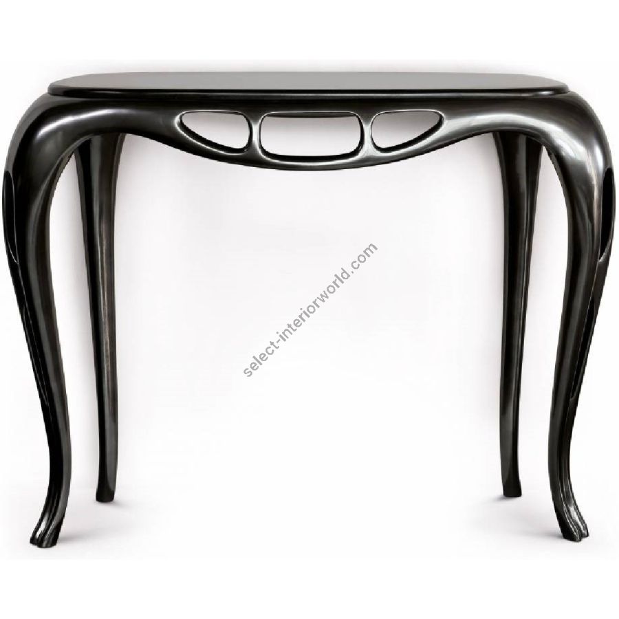 This console is a perfect fusion of sleek, modern design and luxurious materials. The structure, crafted from Lime wood, is lacquered in black nickel, giving it a sophisticated, contemporary finish. The Total Black marble top adds a dramatic touch, with its deep, rich tones and striking surface, making this piece an ideal addition to any refined interior. The combination of the sleek black lacquer and dark marble creates a bold, elegant statement, perfect for modern living spaces.