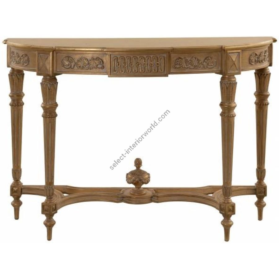 This console features a sophisticated OCH gold leaf patinated white meringue (Oro Chic) finish, showcasing a blend of classic elegance and modern refinement. The carved wooden base and wooden top are beautifully finished, adding a touch of luxury and timeless charm to any space. Its delicate proportions and elegant design make it the perfect statement piece for an entryway or living area, effortlessly enhancing the ambiance.