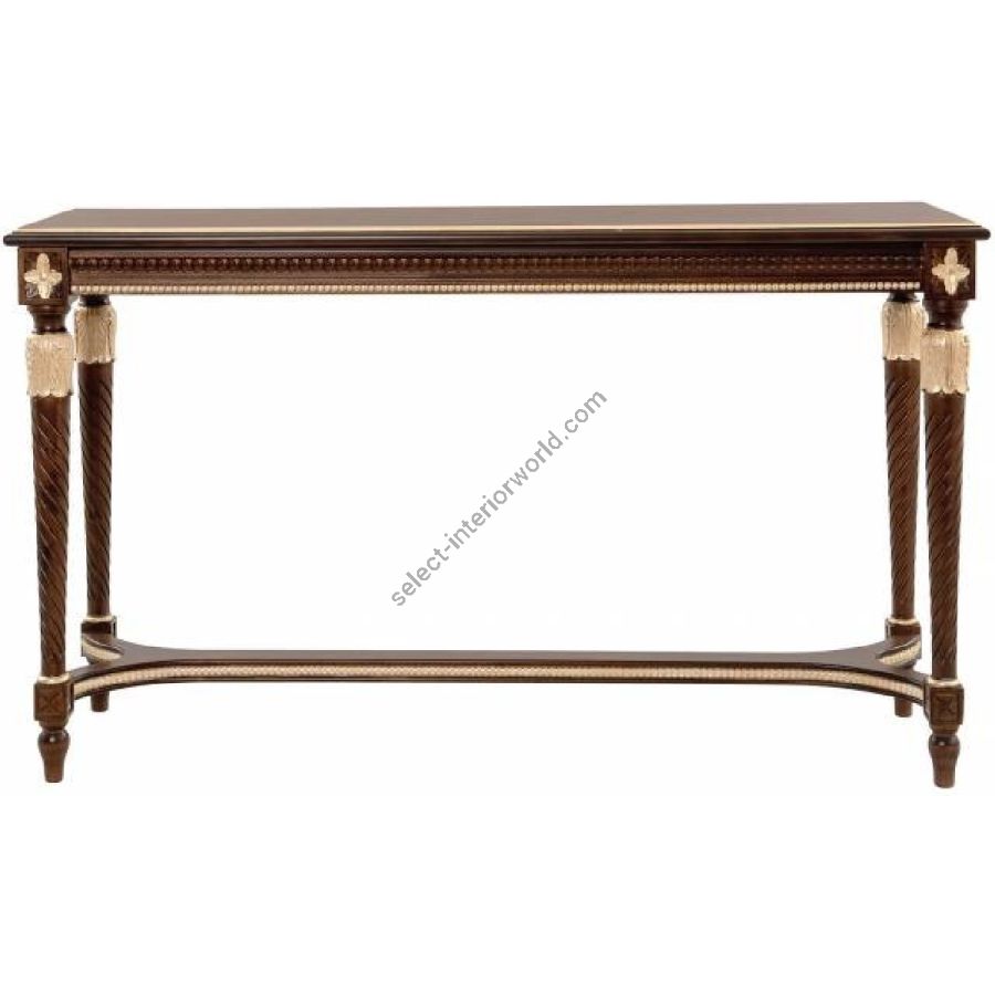 The essence of this console lies in its simplicity, where the beauty of natural wood is enhanced by the harmonious combination of NP5 matt walnut and gold leaf patinated white meringue. The wooden top and carved wooden base showcase a refined design that exudes understated elegance. This piece effortlessly complements any space with its minimalist charm, making it a versatile addition to both contemporary and classic interiors.
