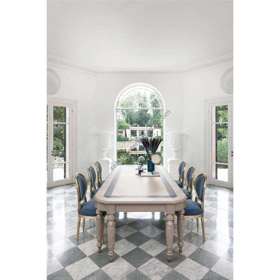The design of this dining table creates a seamless blend of elegance and warmth, with soft, rounded forms that contribute to a calming atmosphere in the dining room. The top of the table, made from canaletto walnut tinged in grey, is accentuated by a delicate inlay of mother-of-pearl and erable tinged blue, framed by a canaletto walnut profile. The finely carved legs are lacquered in a matte grey finish, adding a sophisticated touch to the overall design.