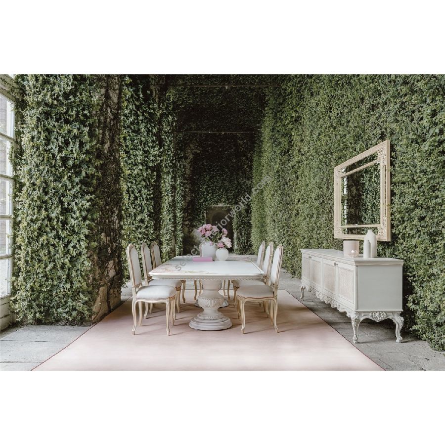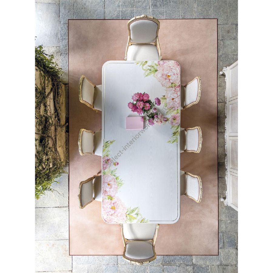 This impressive dining table is a true work of art, measuring 270 cm in length, and featuring a large hand-crafted floral decoration that brings elegance and vibrancy to any space. The centerpiece of the table is a series of peonies, painted in soft shades of pink, peach, and white, arranged symmetrically across the tabletop. The two carved wooden bases are finished in LAFM lacquered brushed French tempera white meringue, with a gold leaf base adding a touch of sophistication. The white lacquered ash background and the top, veneered in ash with white lacquer, complement the exquisite hand-painted floral design, making this table a unique blend of craftsmanship and artistic expression.