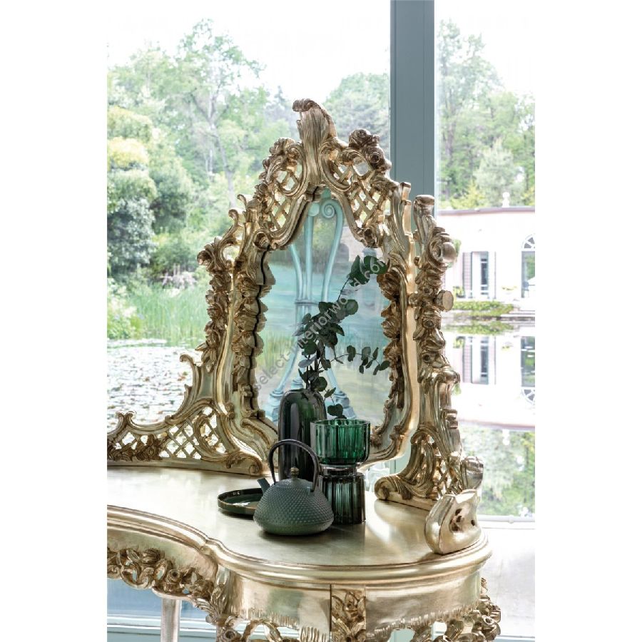 This dressing table with an incorporated mirror is a unique piece that brings character and elegance to any room, thanks to its intricate inlay work. Crafted from carved wood and finished with Silver Gold leaf, it combines timeless beauty with sophisticated craftsmanship. Designed by the Bellotti Ezio Team, this piece is both a functional and decorative statement, elevating the aesthetic of your space.