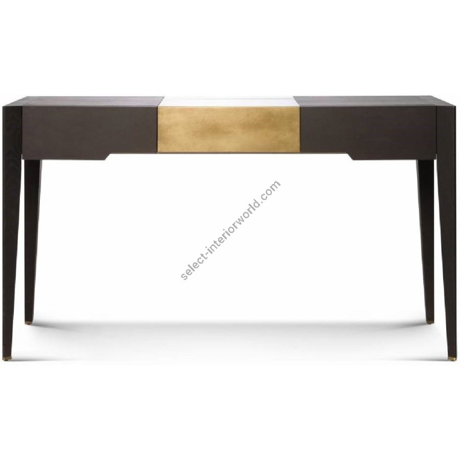 This sleek vanity is crafted from plywood veneered with Ash wood, finished in an urban black shade. It features a central flap compartment with a bronze lacquered finish, revealing a grey-dyed Maple interior. The end-feet are elegantly designed in light bronzed matt brass, adding a touch of sophistication. Designed by Ezio Bellotti, this piece combines modern elegance with practical storage in a refined, minimalist form.