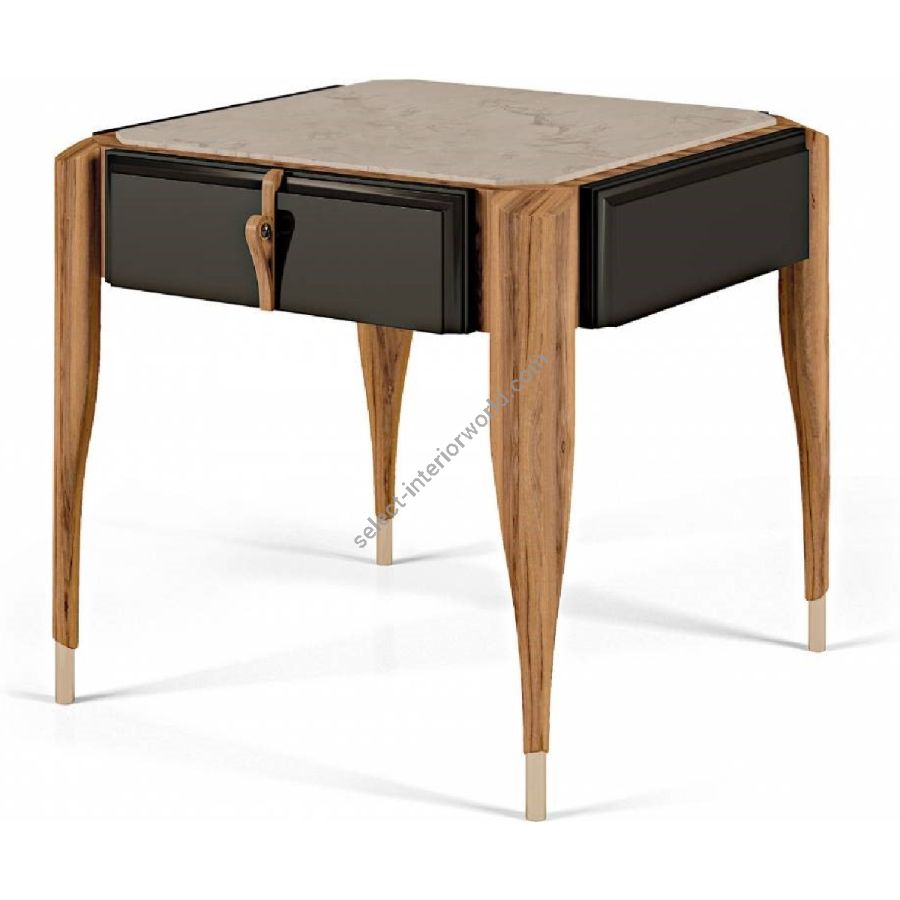 This exquisite night table embodies elegance and sophistication with its glossy black lacquered finish. The handles are adorned with precious stones, adding a touch of luxury, while the solid Canaletto walnut legs ensure durability and refinement. The brass end-feet enhance the table's classic appeal, and the Calacatta Gold marble top completes the design with timeless beauty. A creation of Ezio Bellotti, this night table seamlessly blends artistry and craftsmanship.