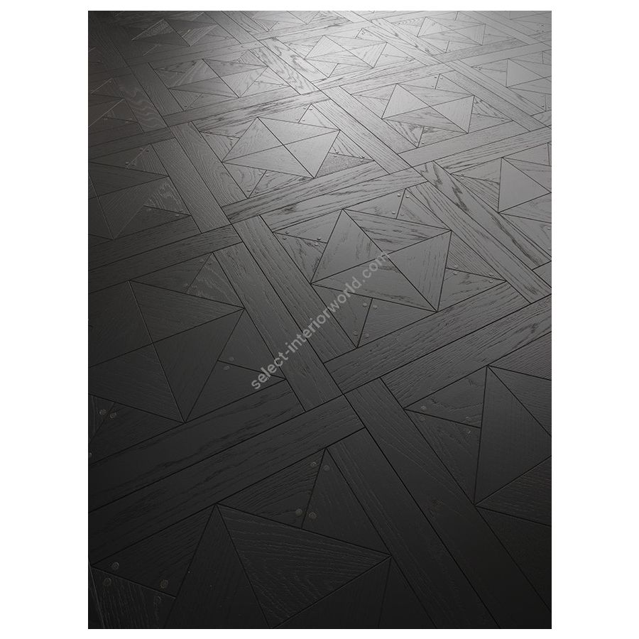 Among the three high-end models of the Stud Tiles series for Diesel Living, which revisit decorative elements in a contemporary key, inspired by the applications of studs and rivets on denim typical of a rock styling, Stud Black is certainly the most iconic. A black parquet of great effect where among the geometric inlays that decorate the wood stand out in contrast the precious metal details that complete the proposal. The quality of a decorative pattern in dark version, consisting of inlaid wooden tiles, which respond to the need to define a refined, bold and atmospheric environment, where the decò trend is combined with an attitude of rock appeal. Stud Black is made of high quality European oak parquet tiles, inlaid according to geometric patterns and worked with deep brushing treatment and color painting.