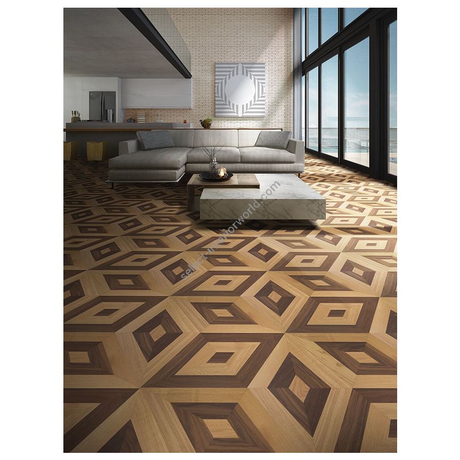The Miami marquetry parquet becomes an element of decor. The pattern in walnut and oak wood, repeated in the surface, creates a unique and unmistakable optical illusion.
