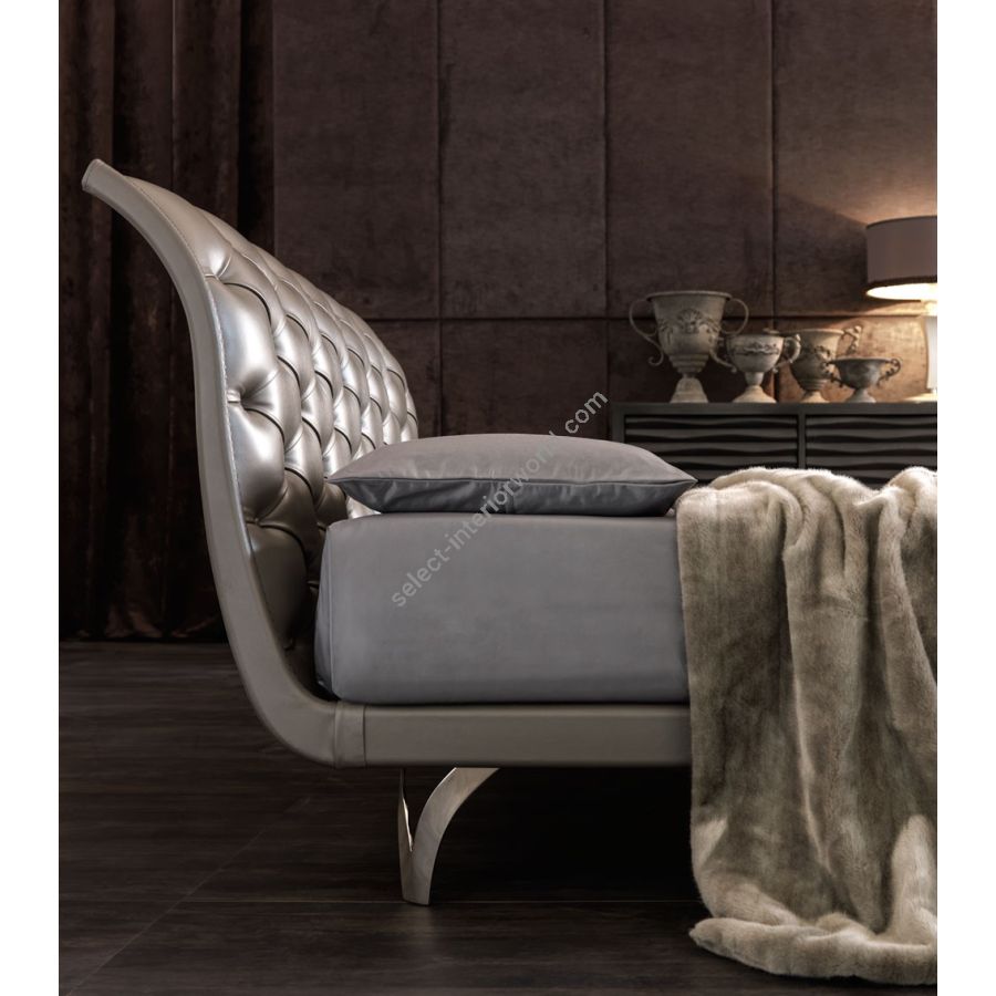 Poplar curved plywood structure, aluminium casting side frame, hand polished and brushed. Iron bedrail covered in leather or eco-leather. Massive fir legs, or in laser cutted iron. Padded bedhead with differentiated density rubber, covered in fabric, leather, eco-leather
