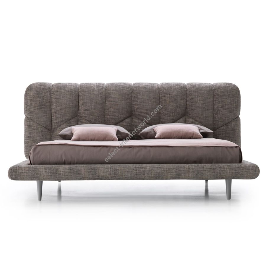Minou bed with soft and sinuous shapes, entirely covered in fabric or leather. The headboard is embellished with seams that create an elegant and original decoration. Generous volumes and light feet that support this welcoming bed with harmonious shapes with ease.