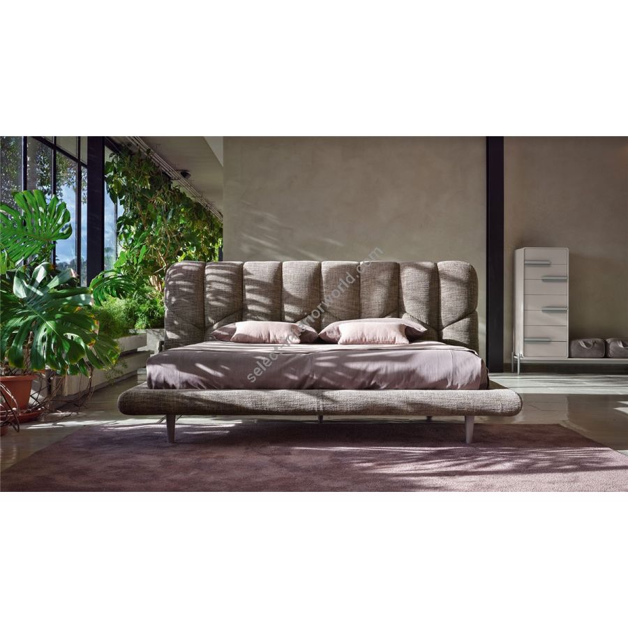 Bed frame in poplar plywood. Headboard and bed frame padded with differentiated density rubber and covered in fabric, leather, eco-leather. Feet turned in solid beech