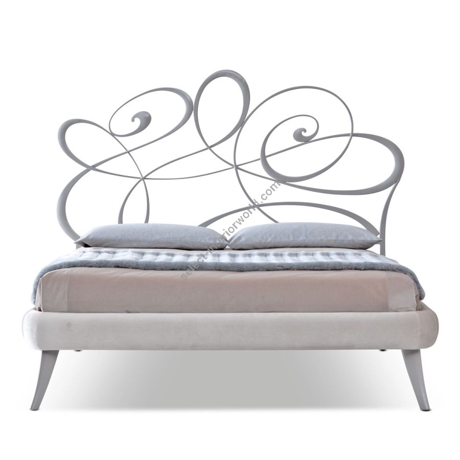A young and romantci bed with bedhead and bedfoot realized in hand-polished laser cutted iron. Twists and curves, aknowledged symbol of the Brand lift up on the centre of the bedhead to create a focus on the manufacturing. Available also without bedfoot and with upholstered bedrail and decorated wooden legs
