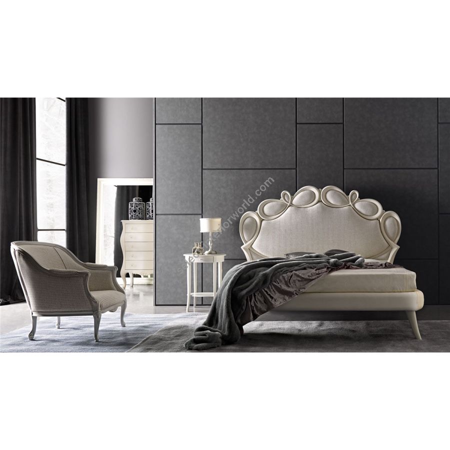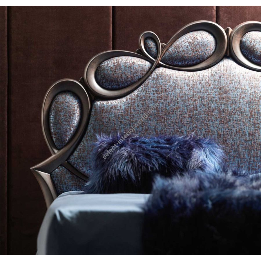A shaped and carved solid wooden bed with an extremely refined and elegant line, enhanced by the upholstered bedrail and the solid wooden legs. The bed is featured by a curvaceous shape, typical of the ornametal “Art Nouveau” style. The charming outline is in the meantime sincere and original. The precious padding and upholstery are integrated also into the crowned frame offering a striking design.