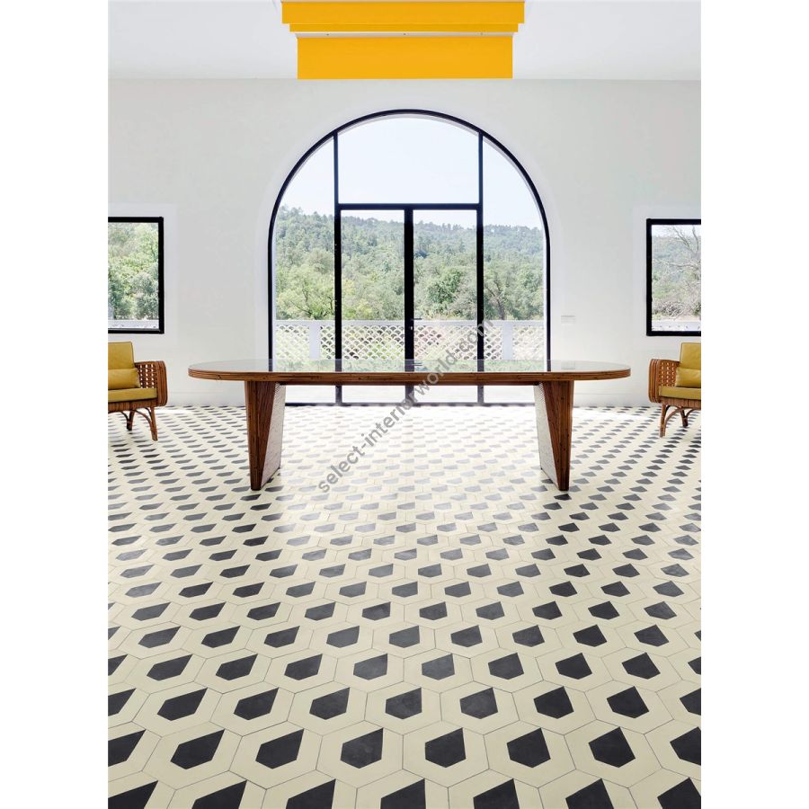 Tiles made entirely by hand using high-strength cement blended with coloured oxides. Square (200x200 mm) or hexagonal in shape (200x230 mm), 14 mm thick, the tiles are cold pressed and treated to protect their surface and ease the cleaning.