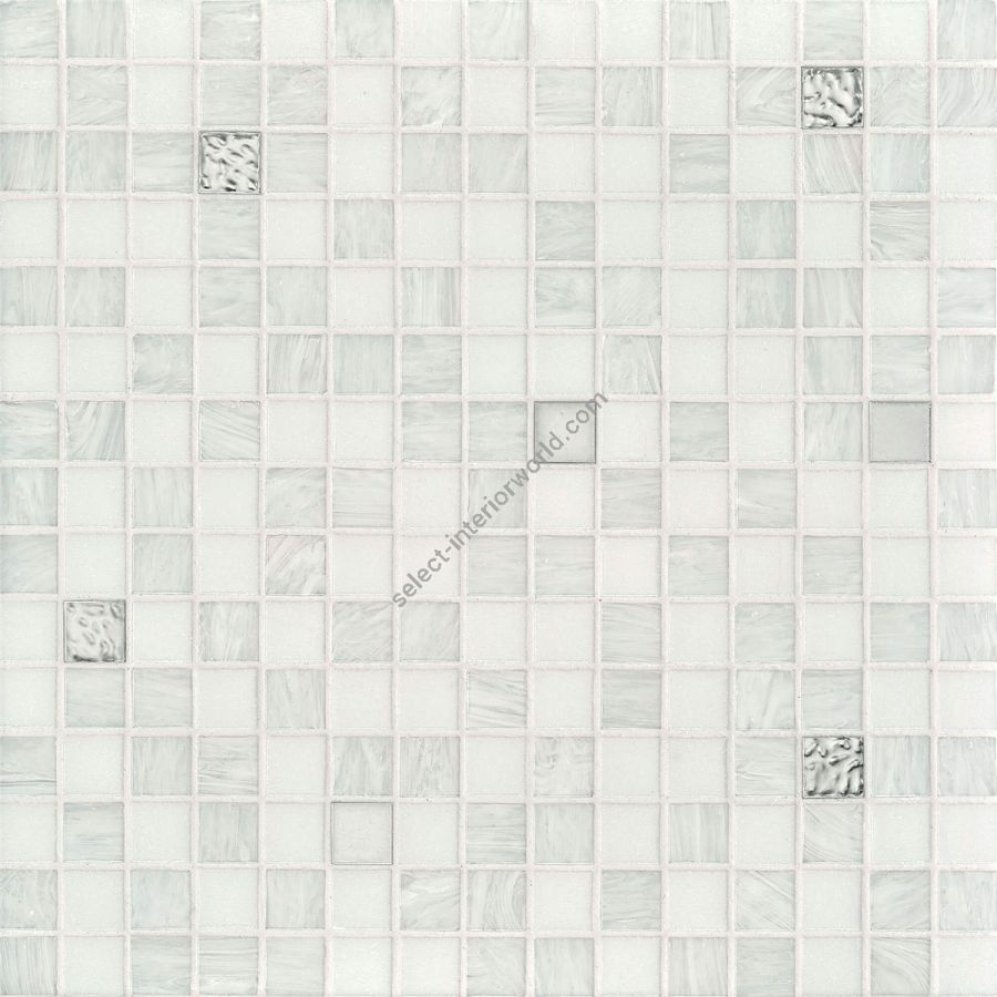 Glass mosaic composed of beveled, randomly arranged square tesserae. The oro bis tesserae present in the blend are fashioned with silver and gold leaf between two protective layers of glass. When used in swimming pools and damp environments, platino must be used in place of oro bis bianco.