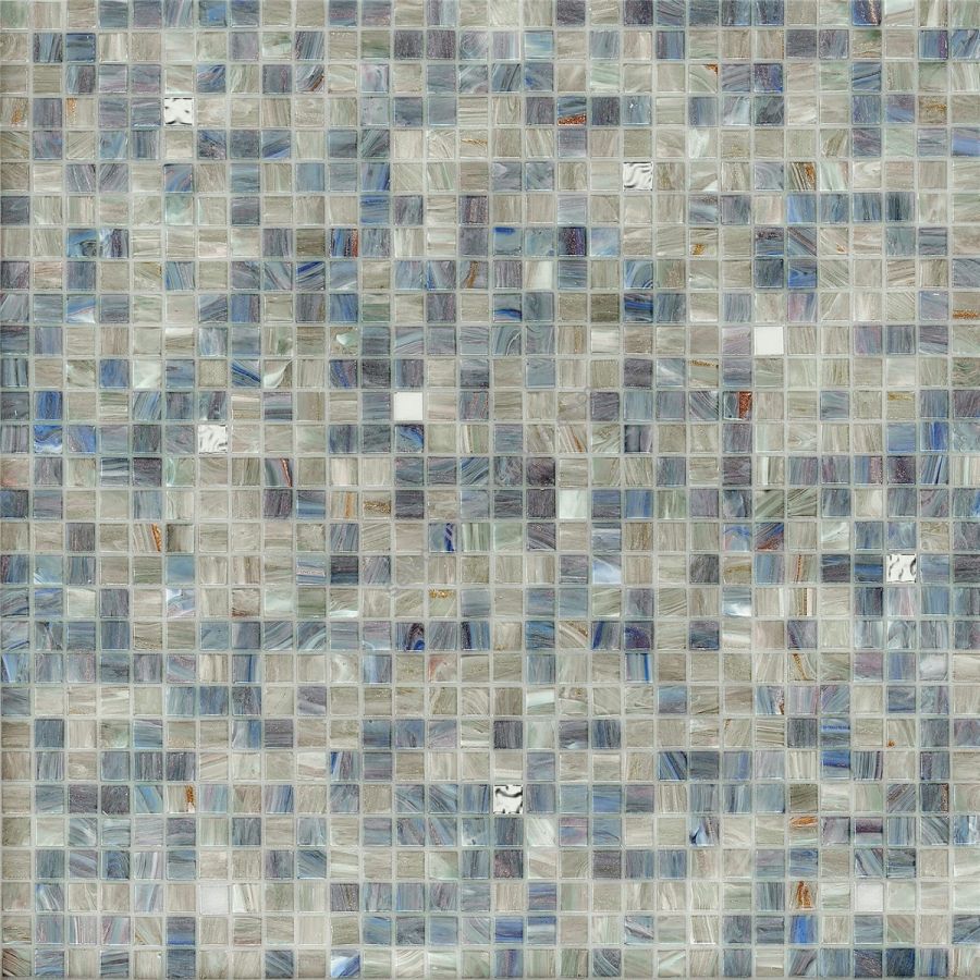 Glass mosaic composed of beveled, randomly arranged square tesserae. The oro bis tesserae present in the blend are fashioned with silver and gold leaf between two protective layers of glass. When used in swimming pools and damp environments, platino must be used in place of oro bis bianco.