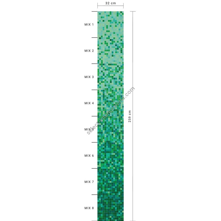 The felce whiteless shading blend is a sequence of mosaic blends arranged in a gradation from light to dark, made with 20x20 mm glass tiles. The shading blend is made up of 8 sheets, with one mix per sheet (mix 1, mix 2, etc.), For an overall height of 259 cm. The individual mixes of the standard shading blends can be sold per sqm. This item is sold by the module. Module dimensions: 0.32x2.588 m (0.83 sq. m). For any customizations, click on “Request information”.