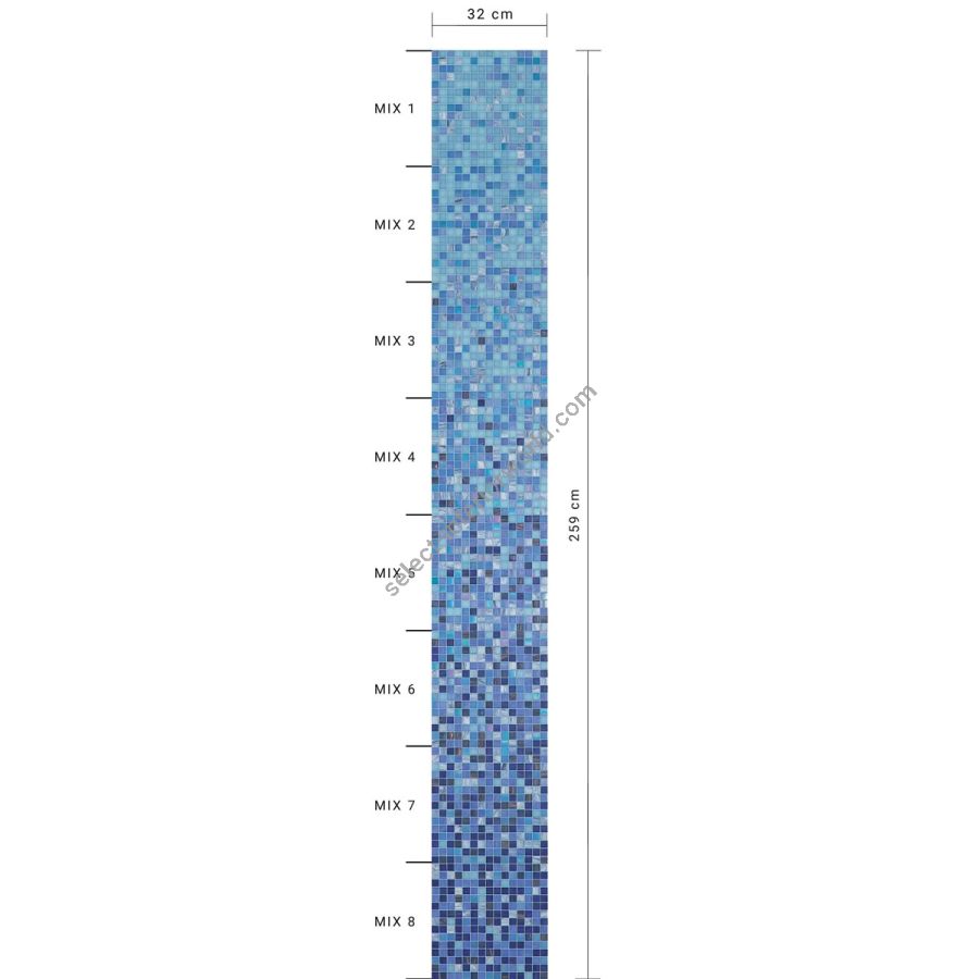 The gerbera whiteless shading blend is a sequence of mosaic blends arranged in a gradation from light to dark, made with 20x20 mm glass tiles. The shading blend is made up of 8 sheets, with one mix per sheet (mix 1, mix 2, etc.), For an overall height of 259 cm. The individual mixes of the standard shading blends can be sold per sqm. This item is sold by the module. Module dimensions: 0.32x2.588 m (0.83 sq. m). For any customizations, click on “Request information”.