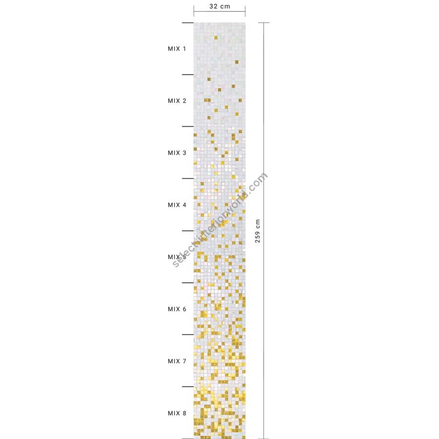 The narciso oro giallo shading blend is a sequence of mosaic blends arranged in a gradation from light to dark, made with 20x20 mm glass and yellow gold tiles. The shading blend is made up of 8 sheets, with one mix per sheet (mix 1, mix 2, etc.), For an overall height of 259 cm. The individual mixes of the standard shading blends can be sold per sqm. This item is sold by the module. Module dimensions: 0.32x2.588 m (0.83 sq. m). For any customizations, click on “Request information”.