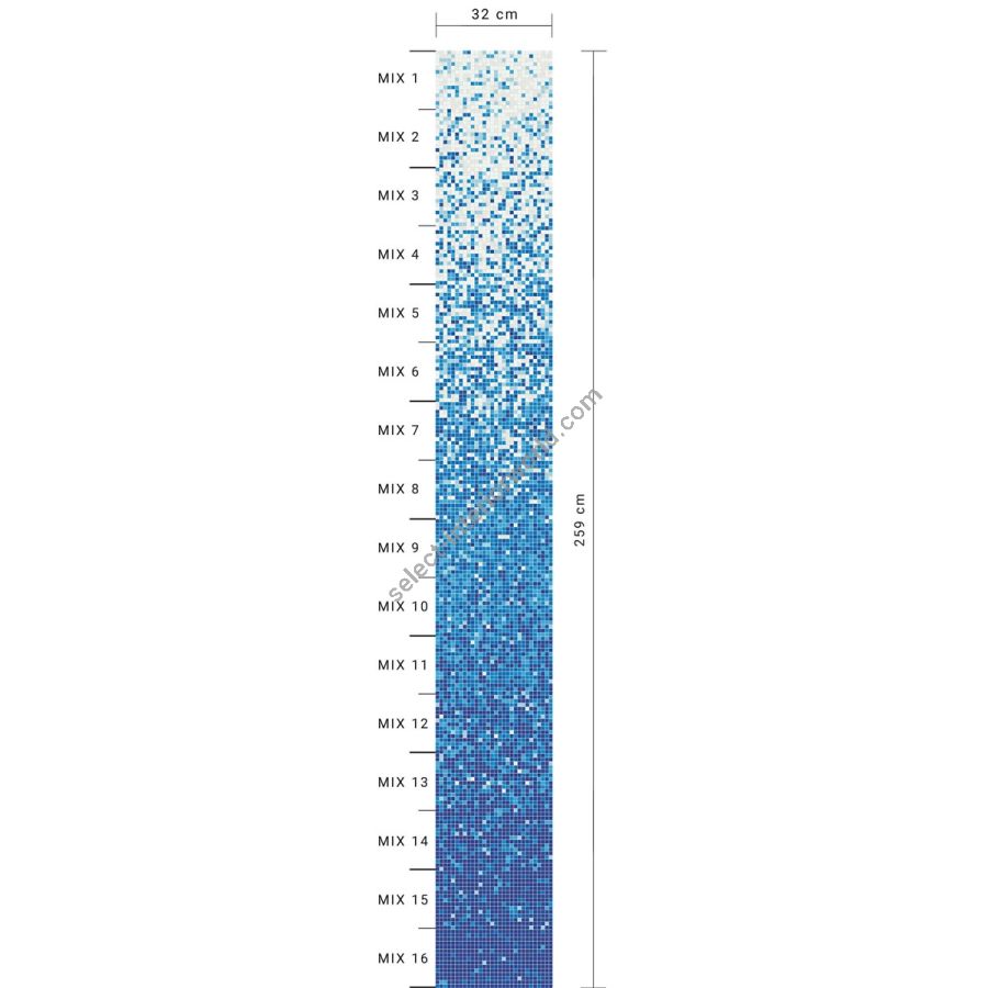 The new fiordaliso shading blend is a sequence of mosaic blends arranged in a gradation from light to dark, made with 10x10 mm glass tiles. The shading blend is made up of 8 sheets, with two mixes per sheet (mix 1, mix 2, etc.), For a total of 16 mixes and an overall height of 259 cm. The individual mixes of the standard shading blends can be sold per sqm. This item is sold by the module. Module dimensions: 0.32x2.588 m (0.83 sq. m). For any customizations, click on “Request information”.