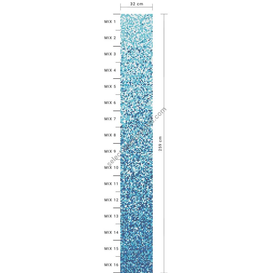 The new iris shading blend is a sequence of mosaic blends arranged in a gradation from light to dark, made with 10x10 mm glass tiles. The shading blend is made up of 8 sheets, with two mixes per sheet (mix 1, mix 2, etc.), For a total of 16 mixes and an overall height of 259 cm. The individual mixes of the standard shading blends can be sold per sqm. This item is sold by the module. Module dimensions: 0.32x2.588 m (0.83 sq. m). For any customizations, click on “Request information”.