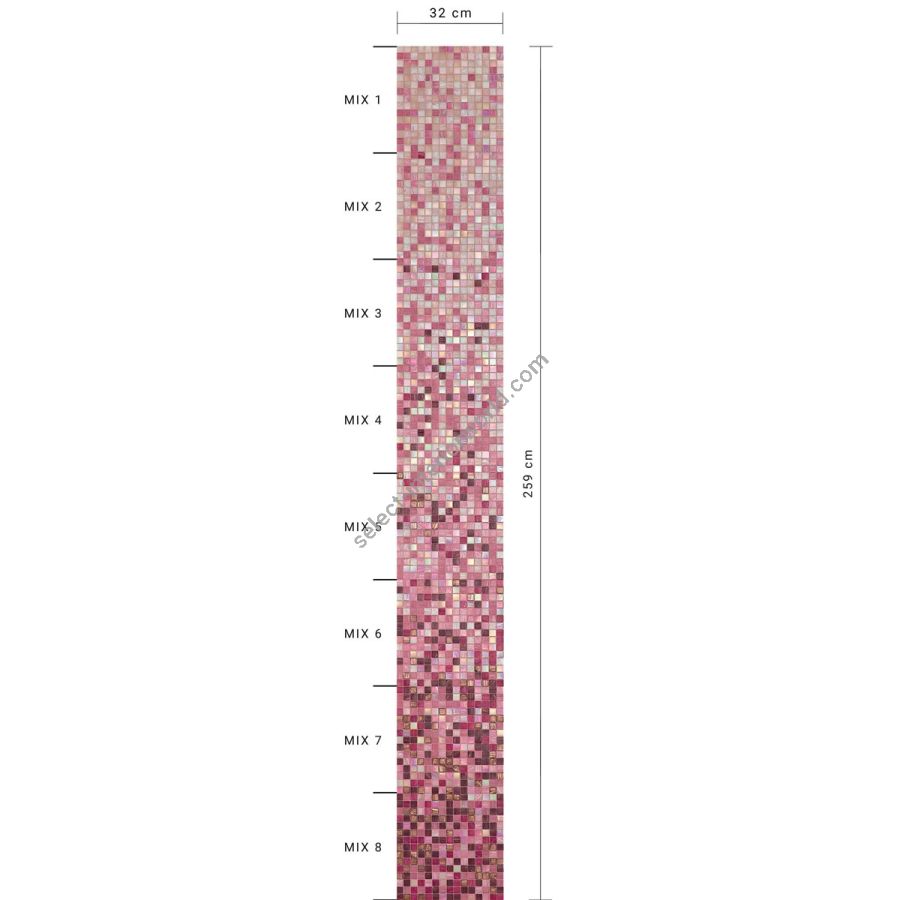 The oleandro whiteless shading blend is a sequence of mosaic blends arranged in a gradation from light to dark, made with 20x20 mm glass tiles. The shading blend is made up of 8 sheets, with one mix per sheet (mix 1, mix 2, etc.), For an overall height of 259 cm. The individual mixes of the standard shading blends can be sold per sqm. This item is sold by the module. Module dimensions: 0.32x2.588 m (0.83 sq. m). For any customizations, click on “Request information”.
