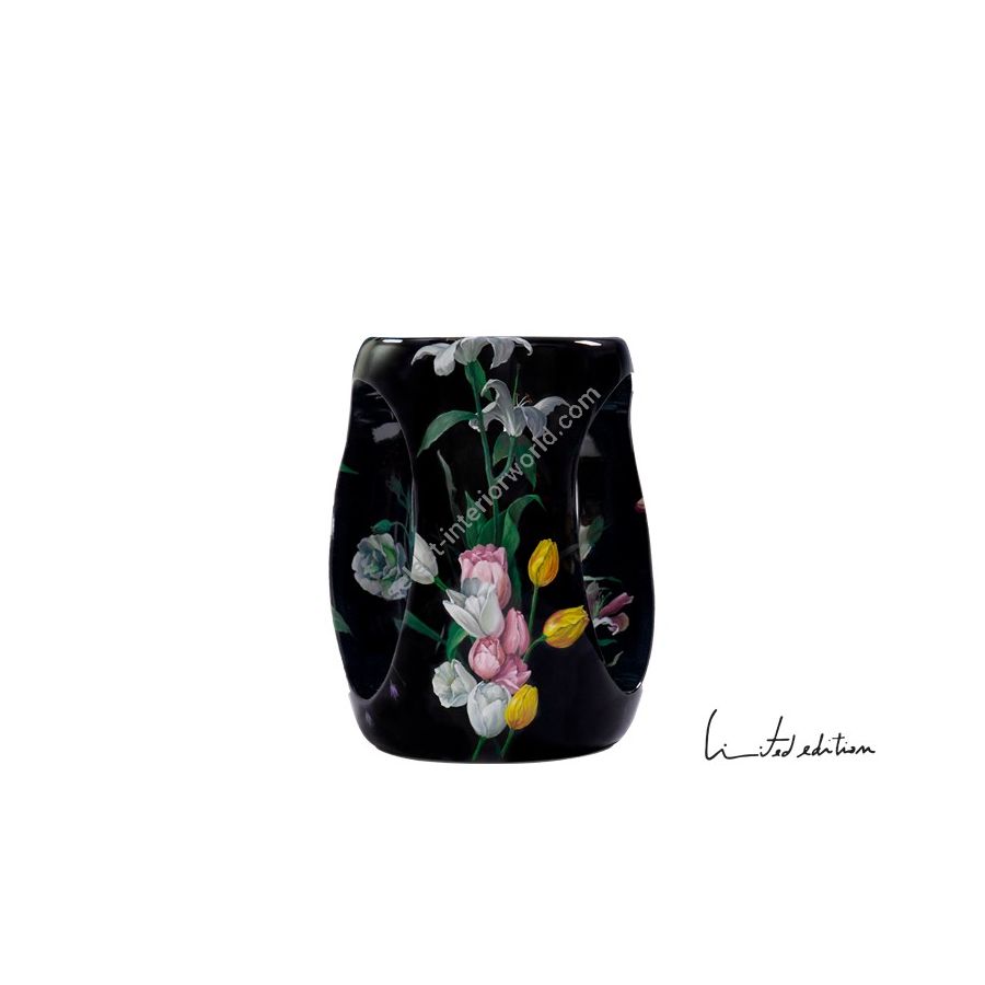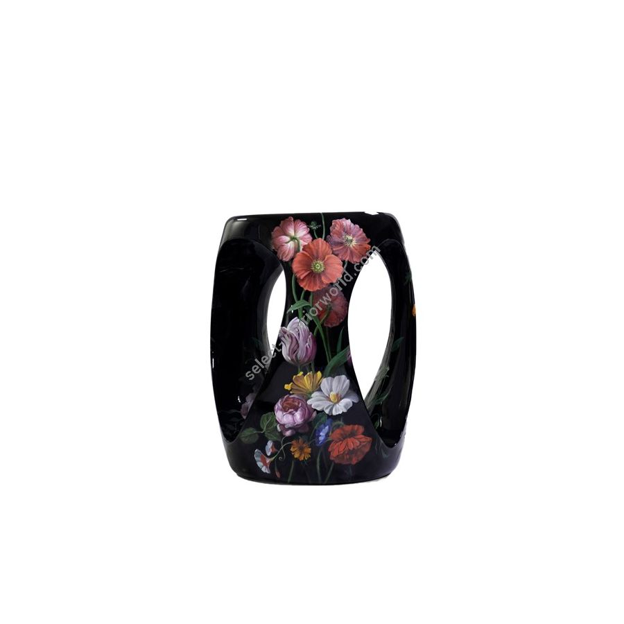 Floral is a soulful stool which evokes Portuguese Romanticism traditions thanks to its gentle flowers delineated with oil paint over a black background. It marries perfectly ancient painting techniques with contemporary design. The Floral art piece was born from the delicate oil painting, which gives a modern look to floral elements. The challenge of recreating an ancient technique to bring to life an Art stool was proposed to Santa Bárbara’s atelier, renowned in Portugal due to its high quality and detail in painting applied to restoration. Expertise in craftsmanship allowed master artisans to adapt this craft often used in furniture and murals. The result is a masterpiece filled with a unique elegance and detail which can only be achieved by hand craft. Its pictorial quality is remarkable.