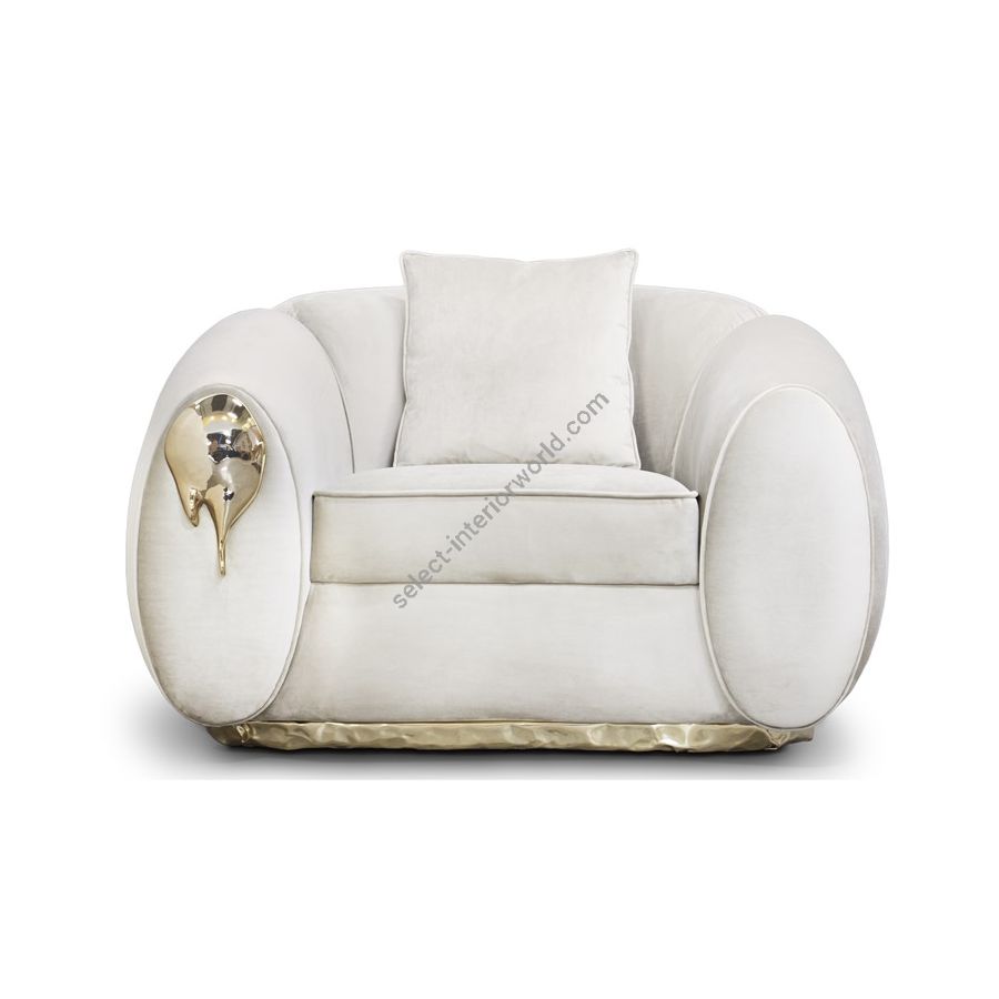 Soleil Armchair is a synthesis of styles and senses. Inspired by the spirit and mission of the famous Cirque de Soleil, the purpose is to invoke, provoke and evoke. Soft, sultry curves gently embrace the sitter in this elegant vintage and contemporary style armchair. Except for the supreme levels of comfort, the brass details on the modern armchair perfectly complement the elegant lines of a timeless piece.