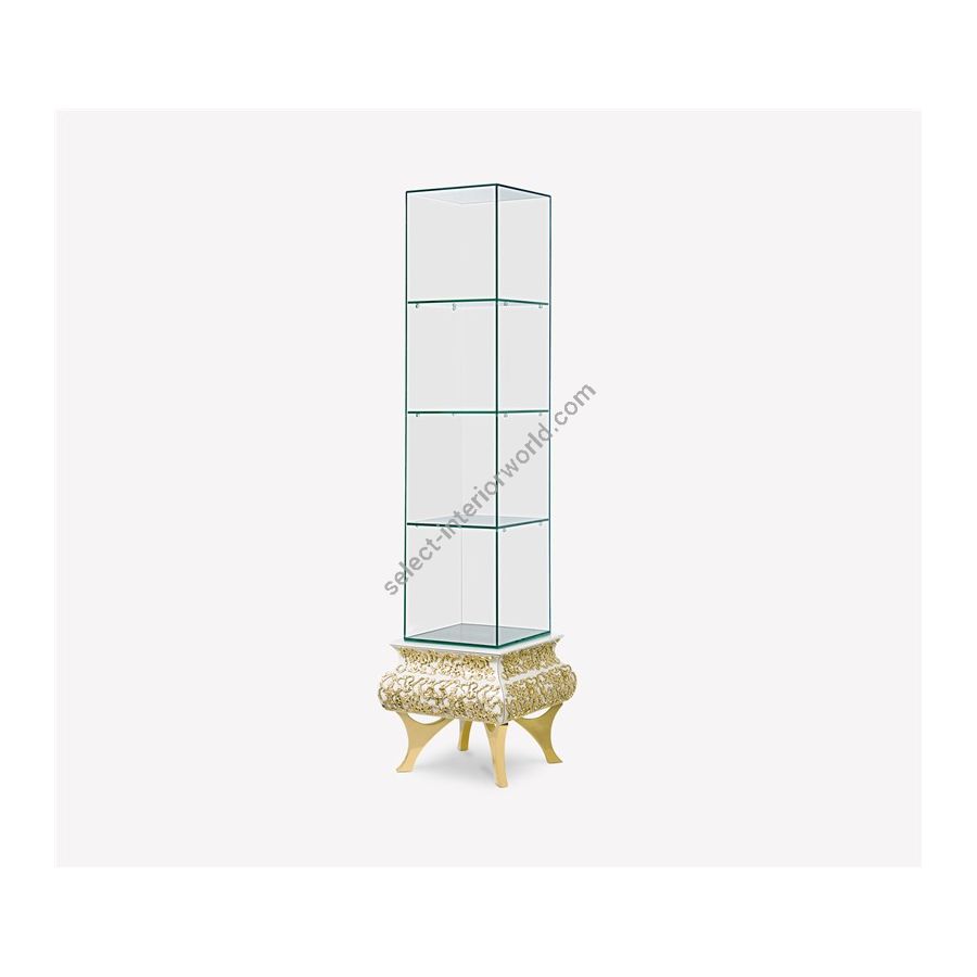Crochet Perfume Display features the traditional Portuguese knitting technique with the most modern design. Designed with tempered smoked glass, this Perfume Display is perfect for your Luxury Bathroom Decor. This product has three shelves with an open back and the structure is in a white cream lacquered wood lacquered with elegant knitting brass details supported by french-style feet.