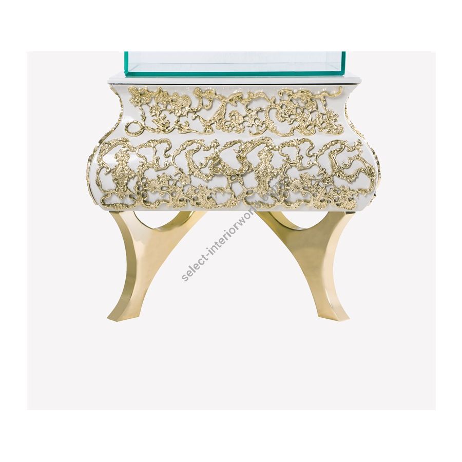 Feet: French-style Polished Brass Structure: Glossy White-Cream Lacquered Wooden, Knitting Polished Brass Details Tempered Smoked Glass with three shelves